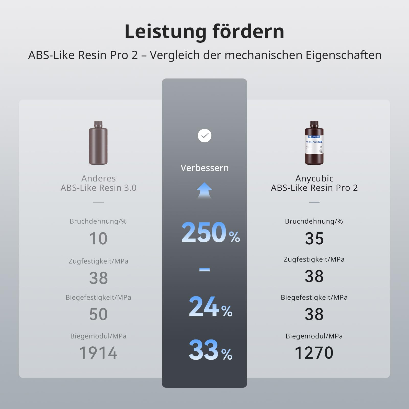 "Improved strength and toughness: Building on the excellent tensile and flexural strength of the previous version ABS-Like Resin +, ABS-Like Resin Pro 2 features improved toughness properties with over 100% increased elongation at break, making the finished model stronger and more durable for printing models with high strength and toughness.