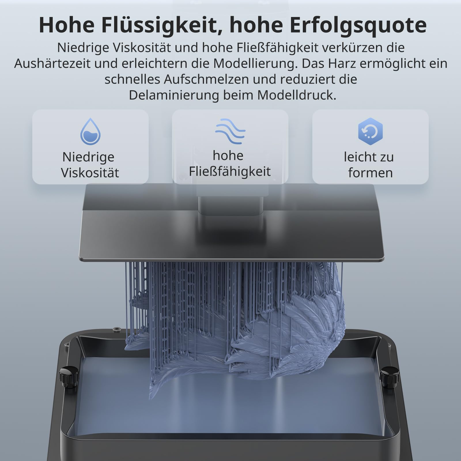 High Printing Success Rate: Low viscosity and high flowability shorten the curing time and facilitate the shaping of models. The resin can quickly flow back, reducing delamination during model printing. At the same time, substrate adhesion is better, effectively reducing the risk of printing errors.