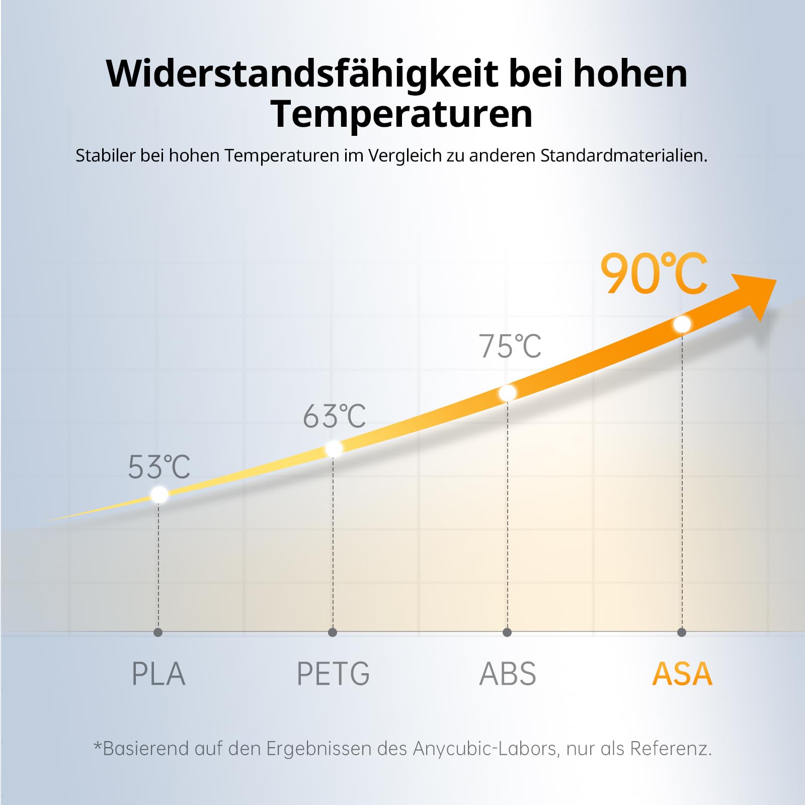 "High temperature resistance: More stable at high temperatures compared to other standard materials. The heat deflection temperature of ASA 3D printer filament is up to 90 °C, compared to 75 °C for ABS and 63 °C for PETG"