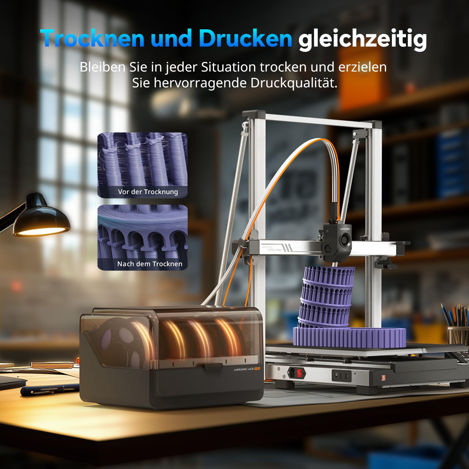 "Drying during printing: Print and dry simultaneously to ensure that the filament remains dry from the inside out, ensuring excellent print quality. And the ACE Pro comes with moisture pre-settings for different types of filament. Simply select the desired filament and wait for the perfect result."