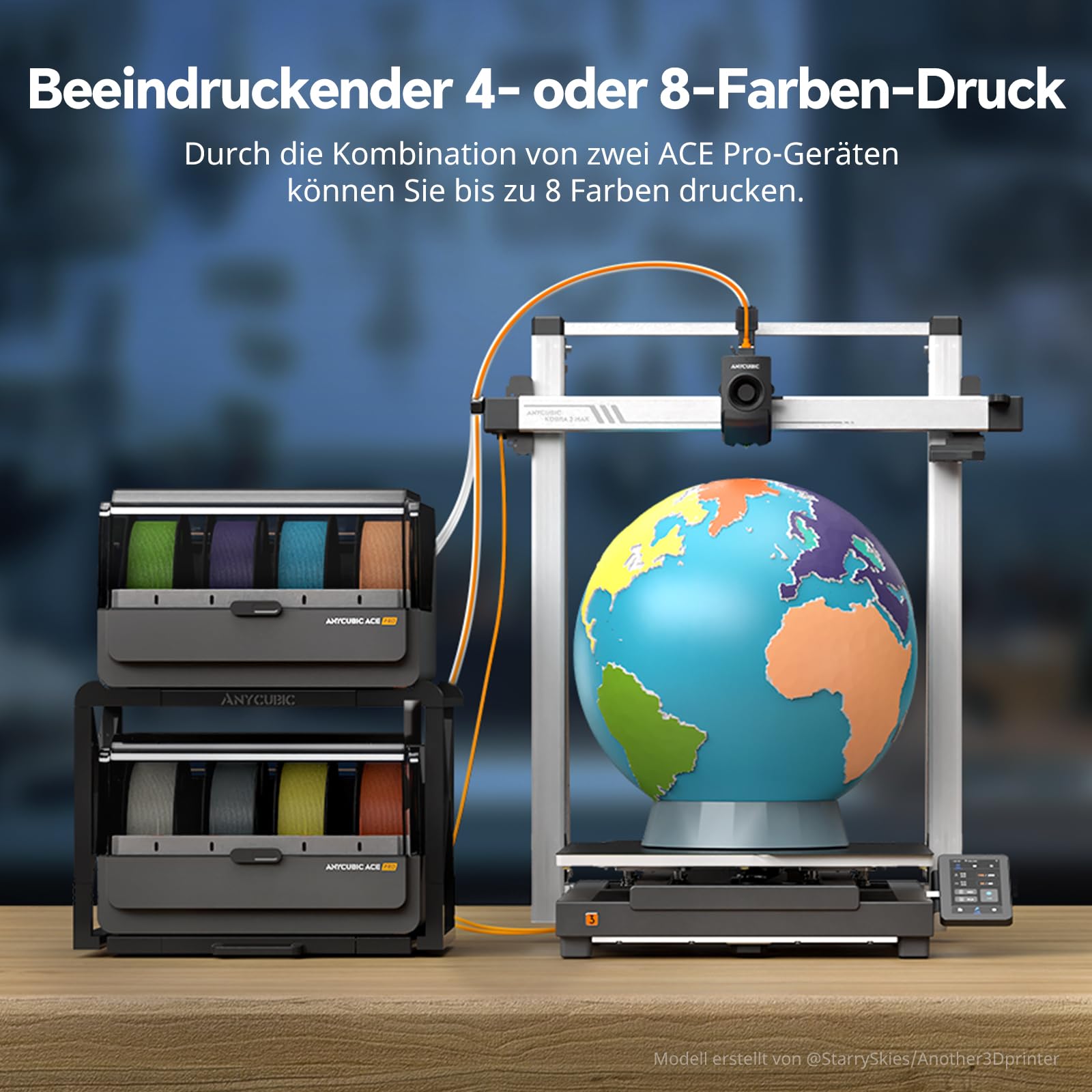 Anycubic Color Engine Pro for Kobra 3 Max series, filament drying with moisture presetting, nozzle clog detection, Intelligent ACE Pro for easier filament management.
