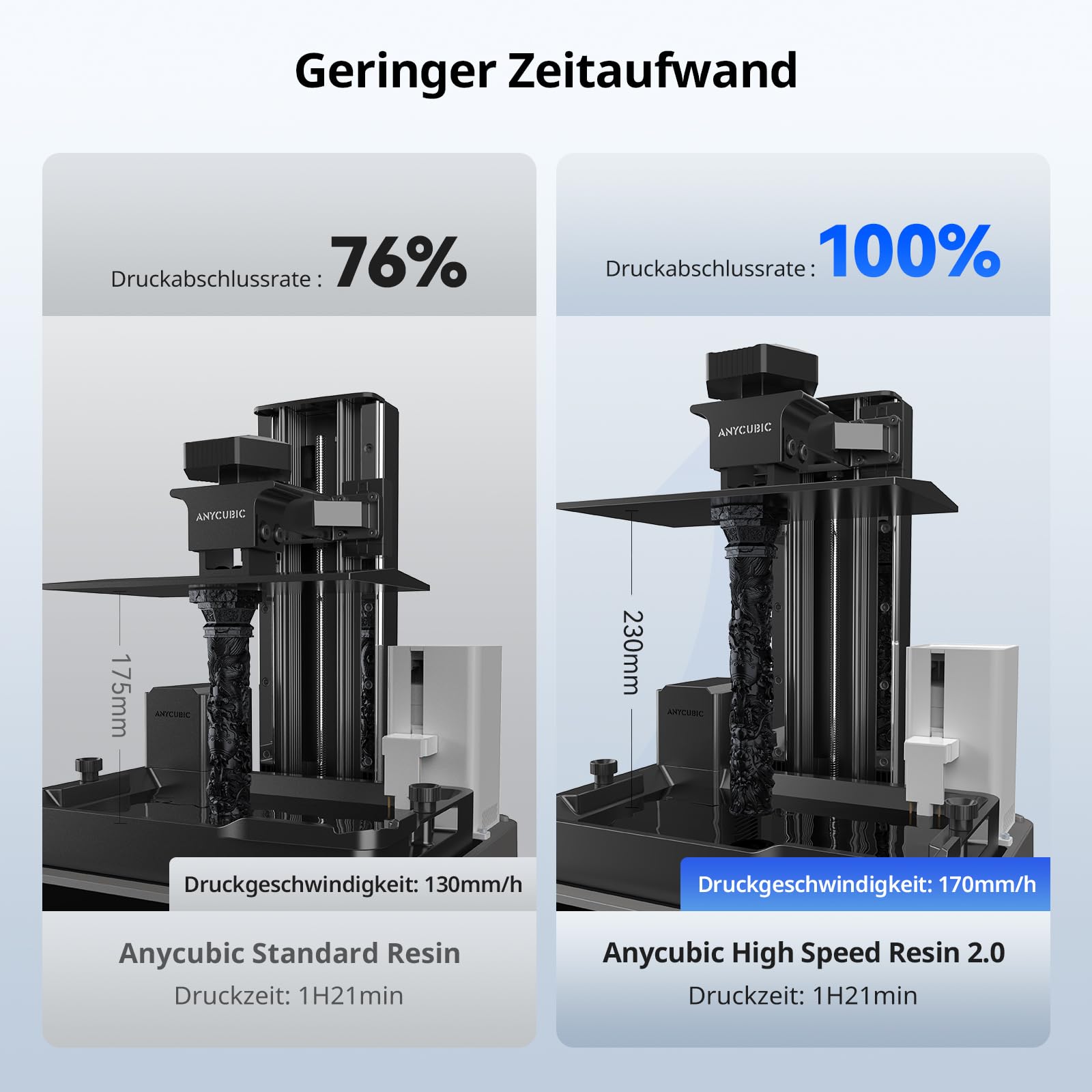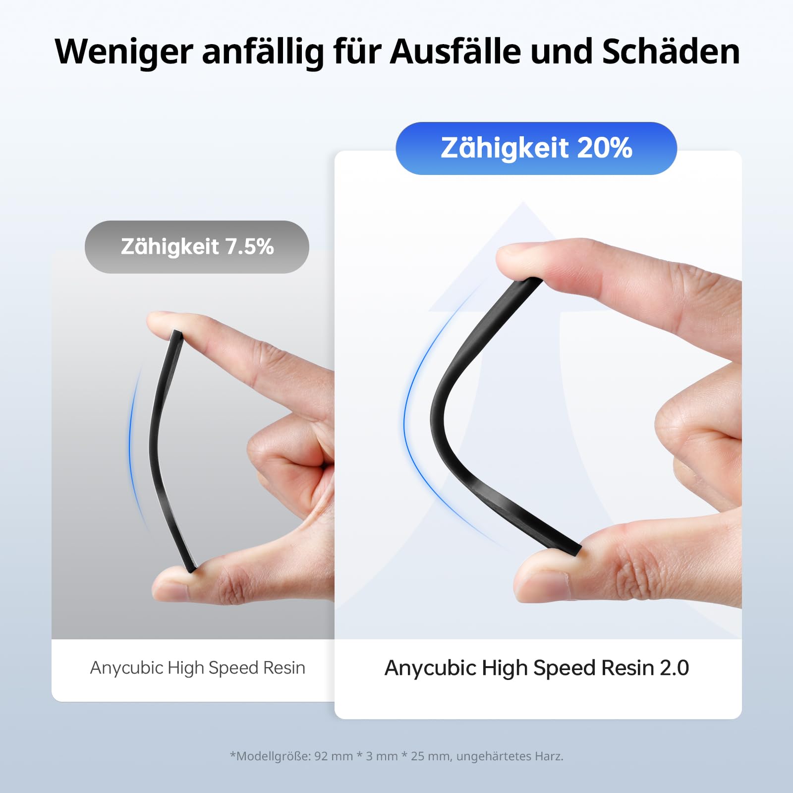 ["High activity, low viscosity: Anycubic High Speed Resin 2.0 has 50% lower viscosity than normal resin. Its low viscosity allows for quick heat dissipation during the up and down movements of the print platform, preventing local overheating and enabling fast refilling.","Faster printing speed: Anycubic High Speed Resin 2.0 only takes 2.11 seconds to print a single layer with 0.1mm layer height when used with Anycubic Photon Mono M7 Pro, 21.56% faster than standard resin. The maximum printing speed is up to 170mm/h, 30.77% faster than standard resin.","Improved printing success rate: Anycubic's research and development team has enhanced the formula of High Speed Resin 2.0. Compared to Anycubic High Speed Resin, the elasticity has been improved from 7.5% to 20%, making 3D printing models less prone to errors and damages.","High fluidity, low shrinkage: The use of High Speed Resin 2.0 can significantly reduce volume shrinkage during curing. The high fluidity of Anycubic 3D resin also contributes to quick curing and less shrinkage. Therefore, Resin 2.0 is perfect for printing models with fine details, exquisite texture, and smooth surface.","Less odor: 3D printer resin High Speed Resin 2.0 has less odor than previous High Speed Resin, providing users with a healthier and more reliable 3D printing experience"]