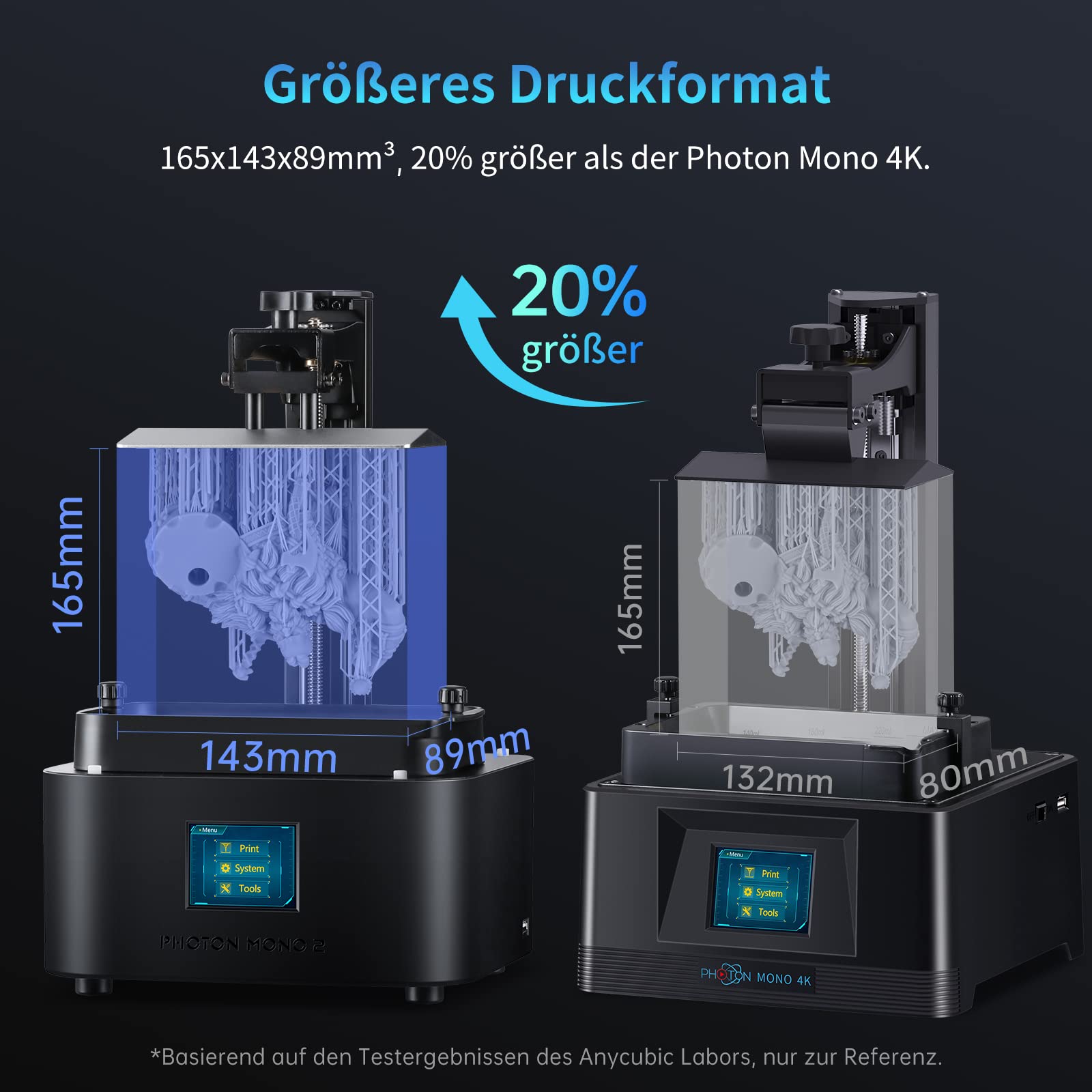 "【Expanded Printing Space】 The resin 3d printer Photon Mono 2 offers a print size of 143x89x165 mm (LBH) and a volume of 2.09 liters, which is a 20% increase compared to the Photon Mono 4k (1.7 liters) - all while only weighing 4 kg. Enjoy a larger print size with the same footprint.",