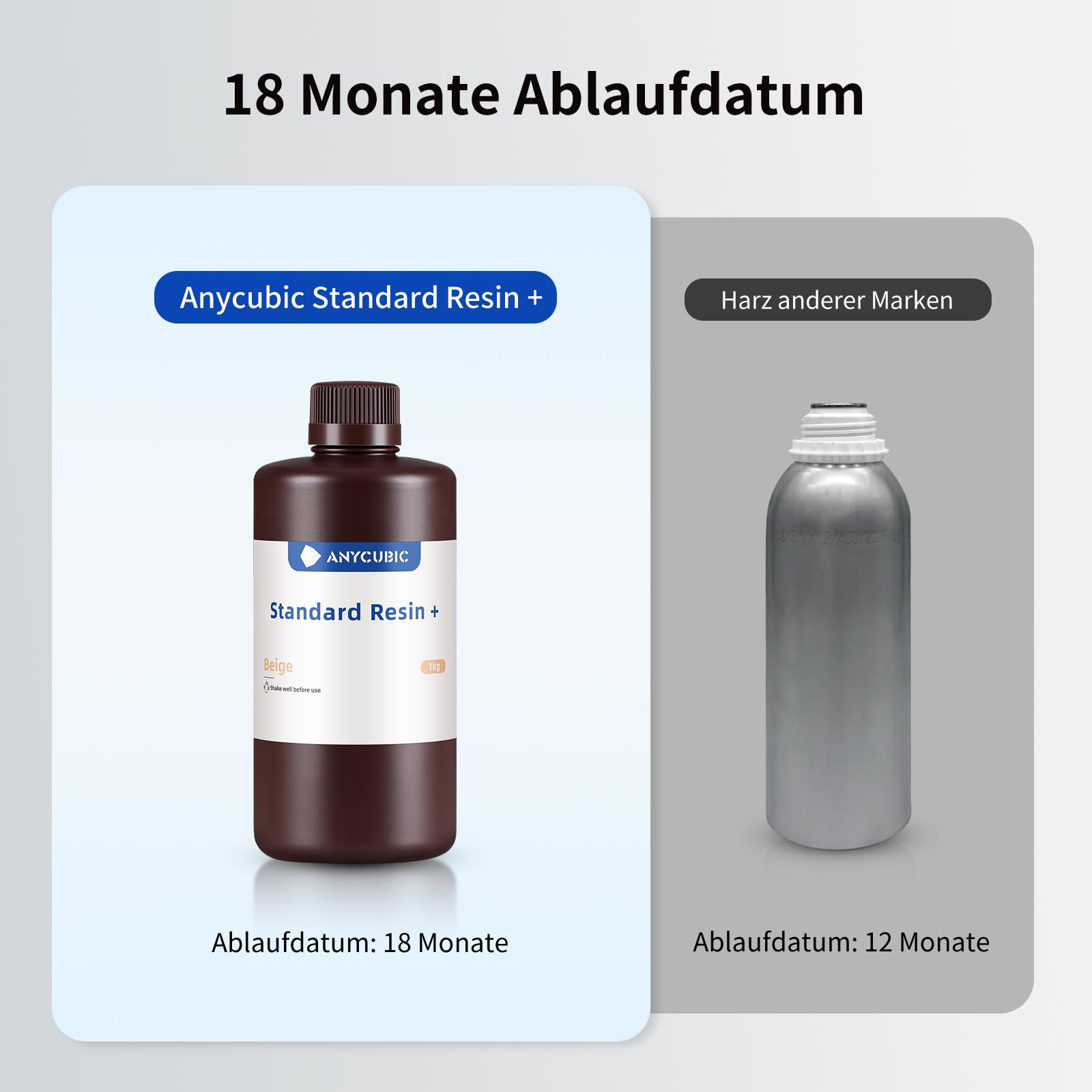 "Durability: The improved new packaging from Anycubic extends the resin's expiration date to 18 months. Resin can be stored longer, so you can confidently purchase and use it.",