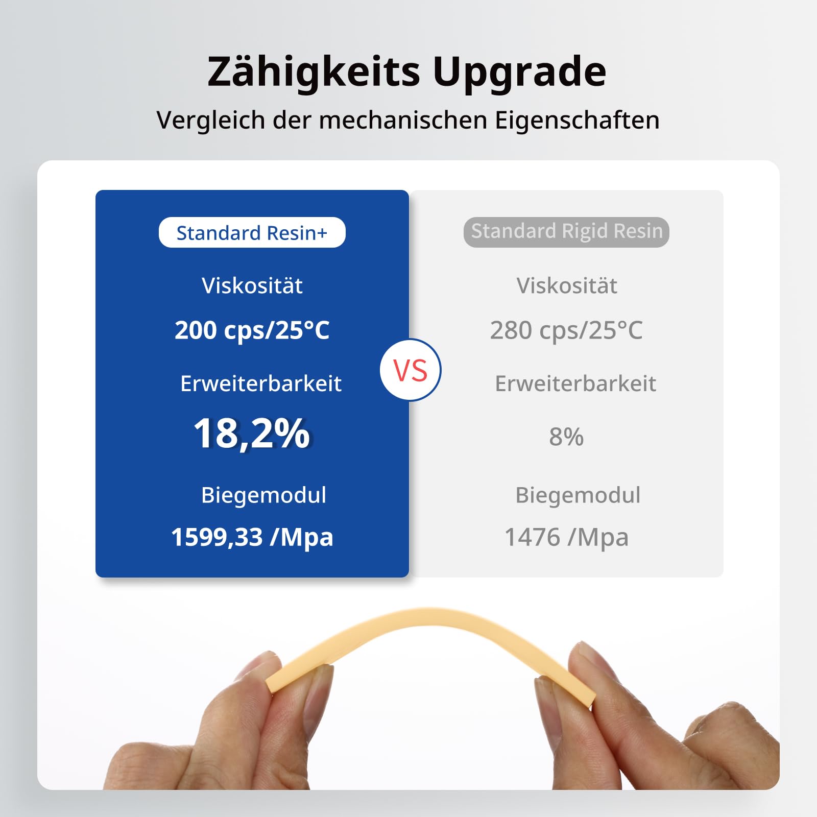 "High strength and toughness: ANYCUBIC upgraded standard resin has a better balance between robustness and resilience. The elongation is at 18.2%. Not only is it detail-rich and impact-resistant, but it is also not easily damaged.",