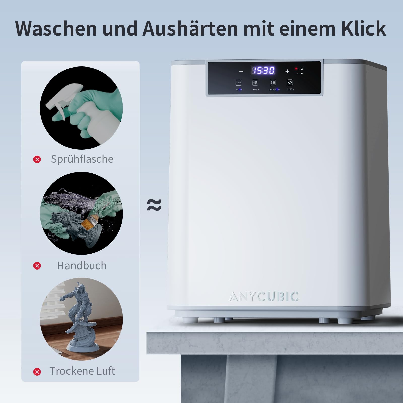 ["Larger washing and curing size: ANYCUBIC Wash and Cure Max can hold up to 14.9 L, surpassing the size of most washing and curing machines on the market. The maximum cleaning size is 300 x 165 x 300 mm (11.8 inches x 6.5 inches x 11.8 inches), 122% larger than Wash & Cure Plus, making it compatible with nearly all resin 3D printers for consumers with a size of 13.6 inches and below","Two cleaning modes: A. Spray cleaning. ANYCUBIC Wash & Cure Max uses mechanical nozzles to generate a strong water jet to quickly release IPA/alcohol onto the print. B. Soaking cleaning. After spray washing, the Wash & Cure machine initiates a bottom soaking to thoroughly remove resin trapped at the bottom or between the intricate details of the models","Alcohol consumption saving: 4L isopropyl alcohol is sufficient to clean large models (10 inches and above), resulting in over 50% savings compared to the 8.5 L required by conventional washing and curing machines","360° dimensional curing: With an automatically rotating curing platform, this washing and curing station provides higher curing energy values and longer radiation distances, allowing for comprehensive and efficient curing of your 3D printed models. The convenient all-in-one flip cover design enables easy opening and closing. The user-friendly control panel interface ensures a smooth and seamless operating experience","One-click washing and curing: Compared to conventional washing and curing machines, Wash and Cure Max can complete washing and curing with a dual function button. Say goodbye to time-consuming post-processing. Experience optimized model processing that saves you time and effort"]