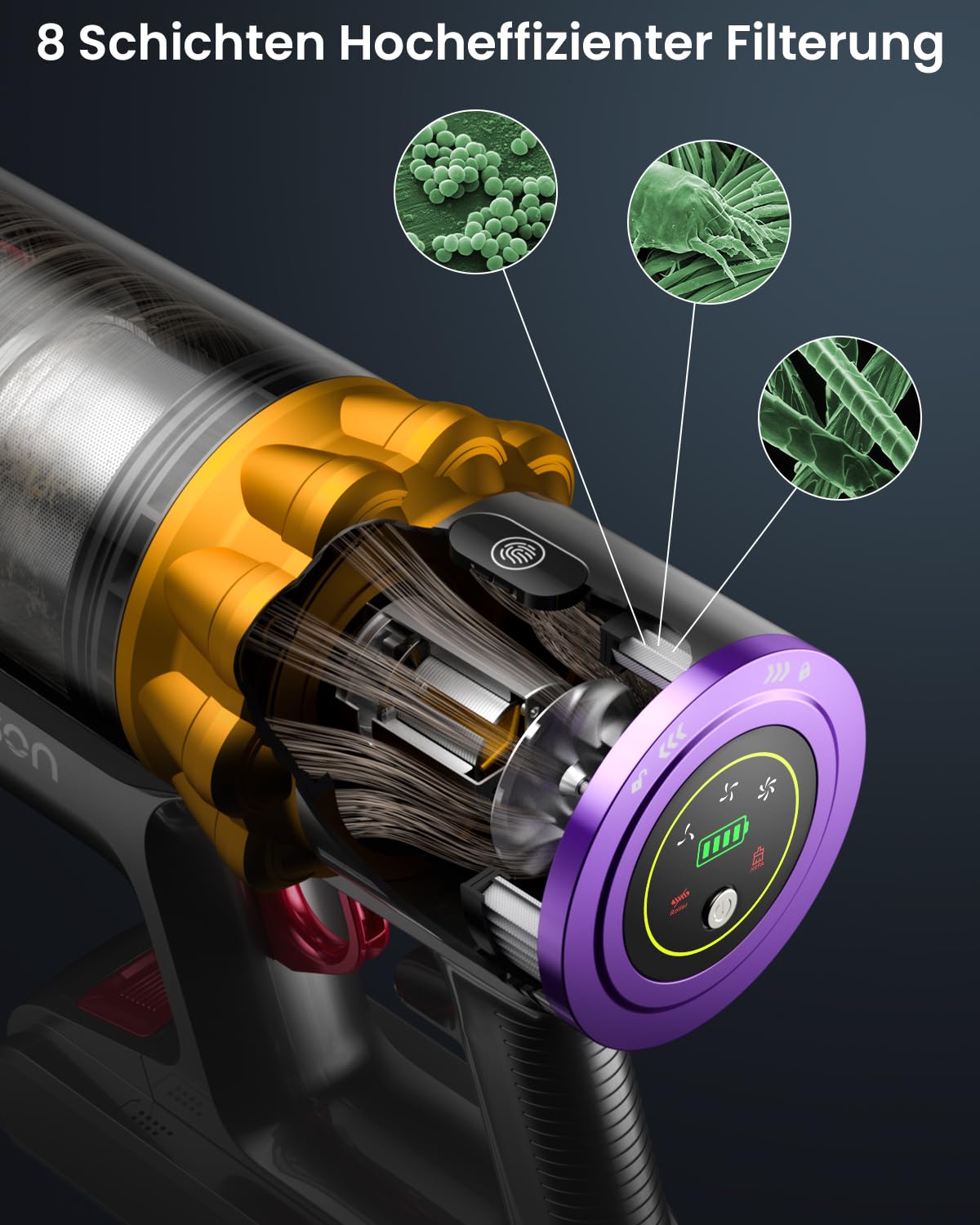 ["【45000PA Super Suction Power】The cordless vacuum cleaner Stars 5 uses special noise reduction technology (noise <62 dB) that can protect your family and pets from loud noises, even when the 550W high-speed motor is working. With powerful suction power of up to 45000pa, it can effortlessly remove large deposits and stubborn stains on the floor, pet hair and lint on the carpet, as well as dust and deposits in corners, dark areas, walls, and high places that are hard to clean.","【70 Minutes Long Battery Life】This cordless vacuum cleaner uses an 8-cell 2800 mAh high-capacity battery. After full charge, it can work continuously for 70 minutes at minimum suction power, and the maximum suction power can cover cleaning needs for 30 minutes. Simply place the cordless vacuum back on the wall mount for quick and automatic charging. NOTE: You need to attach the original charger to the wall mount beforehand.","【V-shaped Anti-Tangle Brush】The cordless vacuum for pet hair is equipped with a new V-shaped roller brush and a 270° flexible brush head that minimizes the chance of hair entanglement and can easily reach table legs, walls, and under the bed as well as other places. Bright LED lights can illuminate dust, so you won't overlook any debris. Facilitates thorough cleaning of floor crevices, embedded pet hair, and dirt in carpets.","【99.99% Highly Efficient Filtration】The 8-layer high-density protection system of the cordless vacuum can filter up to 99.99% of fine dust and bacteria, largely contain dust in the dust cup, and clean the released air. We have also increased the dust container capacity (1.6L), effectively reducing the frequency of emptying. The one-hand operation is more convenient and fun.","【HD Color OLED Display】The highly efficient cordless vacuum cleaner can change suction modes by touch. The OLED display panel tracks remaining battery life and operating status of the vacuum cleaner, and alerts you if the operation is abnormal. Helps you efficiently plan your cleaning schedule and preserve the battery life of the cordless vacuum cleaner. The simple and high-resolution, super large icons are suitable for short-sighted people as well as middle-aged and elderly people.","【7*24-Hour Customer Service】ANYSON always adheres to the concept that the customer comes first, and we hope to provide you with the best products and services. You enjoy customer service + 2 years return and exchange service. If there are any problems during the use of the vacuum cleaner, please give us the opportunity to provide support. Thank you in advance!"]