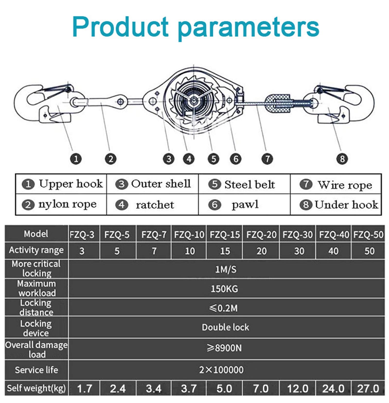 ["Fall Protection]: The height safety device uses an anti-ratchet double disc brake system to automatically control based on the speed difference of the falling human body. This prevents damage caused by the fall and provides effective fall protection for workers.","[Professional Detail Design]: 1. The Personal Fall Limiter has a D-type shackle made of alloy steel with high load capacity. 2. Wear-resistant PVC coating reduces wear between rope and hook. 3. The retractable fall arrester uses an anti-collision leather pad to reduce damage to the steel wire rope on the shell when quickly retracted.","[Durable Material]: The height safety device is made of special alloy steel, which is lightweight, corrosion-resistant, rotation-resistant, and impact-resistant. Sling ropes and safety belts are flame retardant and resistant to high temperatures of 200°C.","[Fall Protection Device Parameters]: The movement range of the high-altitude fall protection equipment is 3m / 5m / 7m / 10m / 15m / 20m, the locking distance of the safety rope is not more than 0.2m, the breaking load is not less than 8900N, the maximum load is 150kg.","[Widely Used]: Suitable for industrial poles, high-altitude work, roof construction, power maintenance, ships, climbing, etc. The height safety device is connected to the connecting ring on the back of the safety belt to ensure safety during work."]
