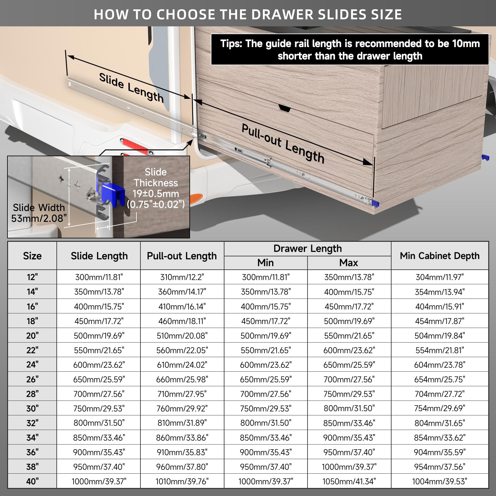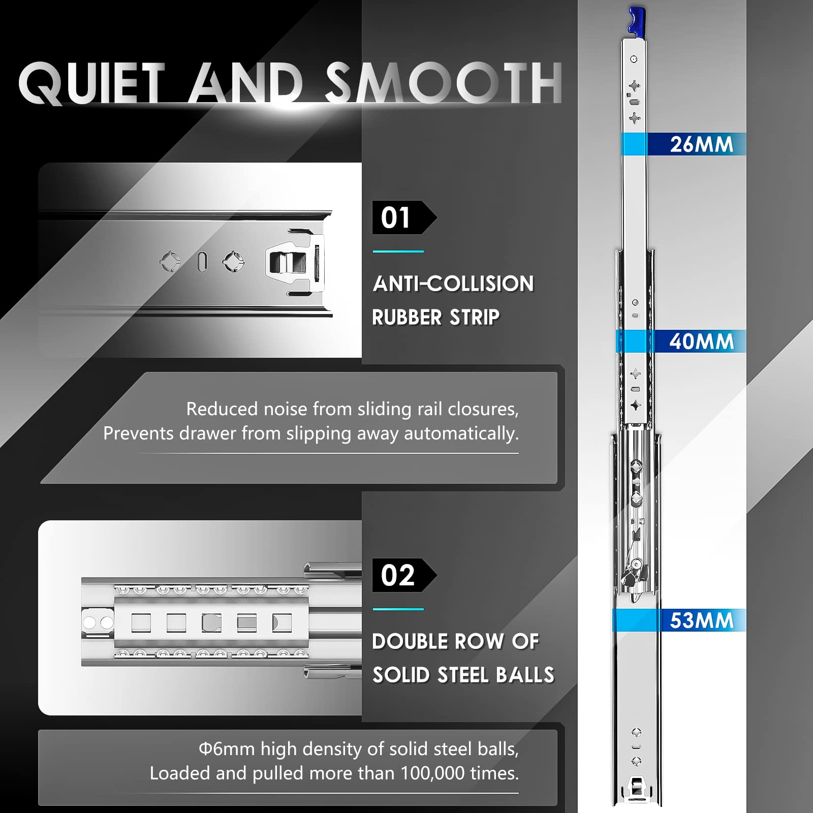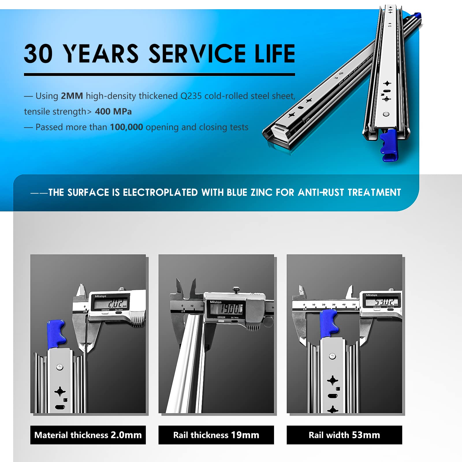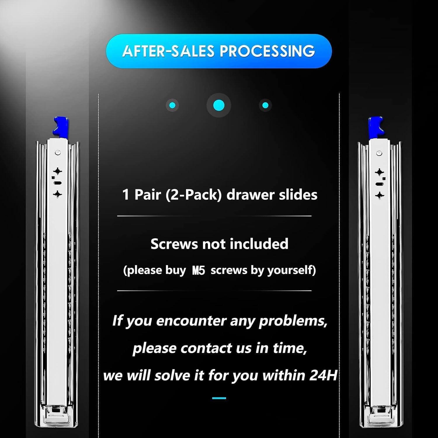 ["Rust protection and long lifespan】Adopt a galvanic blue zinc treatment. The galvanization layer prevents direct contact of air with the rail steel plate, thereby resisting oxidation and corrosion. They have passed more than 100,000 opening and closing tests, they are durable and the normal lifespan of runners is more than 30 years","【Side mount drawer slide】Quantity: 1 pair (2 pack) No screws. Load capacity: 154 lbs. Length: 1000 mm (40 inches). You can choose the size of the slides according to the depth of the drawer. *The length of the rail should be ≤ the length of the drawer. Installation spacing: 19.5 mm (each)","【High-performance drawer slides lock】Swivel the black handles to lock and unlock. They can be locked both closed and fully open. Prevent slipping. 3-stage ball bearing drawer slides with full extension, allowing the drawer to be fully pulled out, which is convenient for storing items.","【Removable and smooth】Press and hold the black locking handle at full extension and pull it out to complete the separation. , Easy to install smooth and quiet.","【Warm Tip】: The products are metal products. Please protect your hands. It is recommended to wear gloves when installing. If you have any problems, please contact us first. AOLISHENG - Provide you with high-quality slides."]