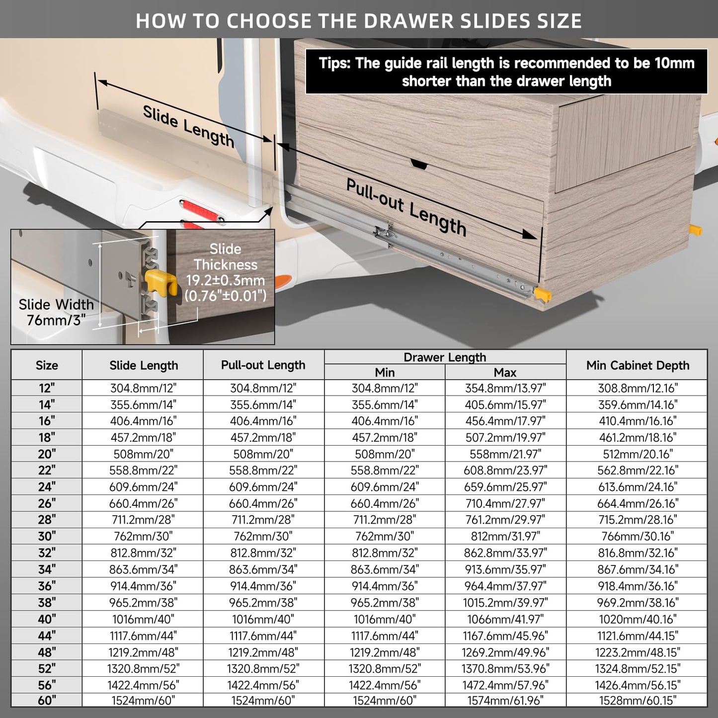 ["🌟Lock drawer guide: The drawer can be locked using the locking function or unlocked by gently pulling the locking handle. (This locking rail is not separable).","🔥Sturdy drawer guide: When the rail is fully extended, the drawer guide is made of high-quality cold-rolled steel, capable of supporting 110 kg, vending machines, etc.","🌟Runner bracket: The installation space on both sides of the drawer must be 19 mm * 2 (0.75 inches * 2). Length: 52 inches (1300 mm). Suitable for long cabinet depths of 52-54 inches (1300-1350 mm). Note: Screws are not included.","🔥Rust and corrosion protection: AOLISHENG drawer guides are treated with galvanic blue zinc coating. The galvanized layer can prevent direct contact between the air and the track steel plate, thereby resisting oxidation and corrosion.","🌟Sturdy ball bearing guide rail design, easy to install. You can purchase M6 screws according to your slide installation scene. The warranty period of the slide rail is 1 year. You can contact us at any time to solve various quality or usage problems."]