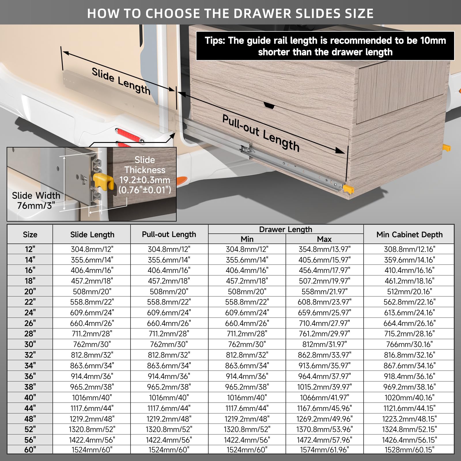 "🌟【Runner bracket】: The installation space on both sides of the drawer must be 19mm * 2 (0.75 inches * 2). Length: 38 inches (950mm). Suitable for long cabinet depths of 38-40 inches (950-1000mm). Note: Screws are not included.",