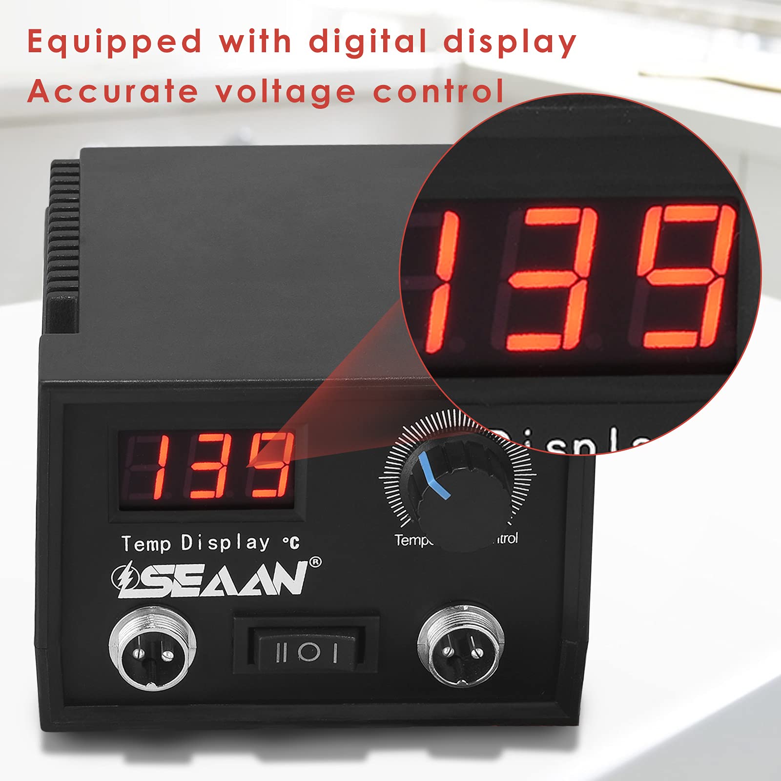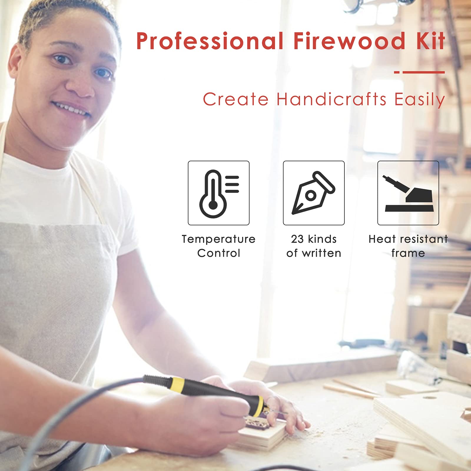 ["Digital temperature display adjustable The temperature of the wood burner pen set can be adjusted from 32°F to 1472°F. You can quickly and accurately set the target temperature via the digital display, and the thermostat helps you effectively control the temperature. Non-slip soft grip The ergonomic pen design, compact and lightweight, with uniform and soft lines, allows you to create beautiful works. The pen has a light weight of 33 g with a short distance between the grip and the pen tip, allowing for drawing fine details, ensuring long-term use. Dual wood pen with 30 iron tips The marking machine includes 30 marking tips that can be used on a variety of items such as wood, leather, and water bottles, creating a variety of rich patterns according to your needs. Wood marking kit 60 W, 220 V wood burner, quick heating, energy saving, and environmental protection. The professional marker is made of insulated, heat-resistant plastic. It is soft and comfortable, non-slip, and does not burn hands, perfect for beginners. Note After soldering, iron oxide and iron carbide will damage them and reduce heat conduction, please clean the soldering iron with a clean sponge. For the needle display version, refer to the parameters on the needle gauge to adjust the desired temperature."]