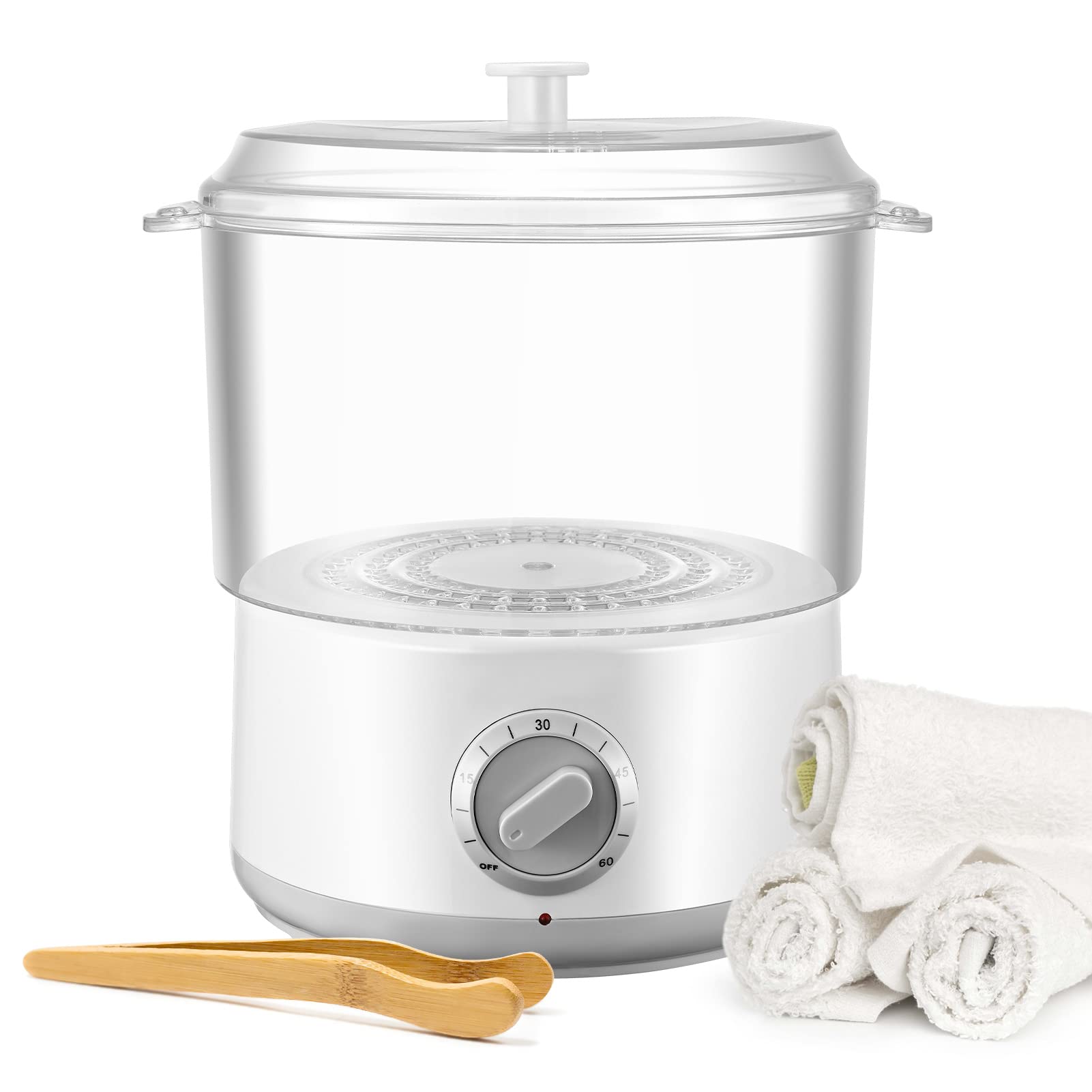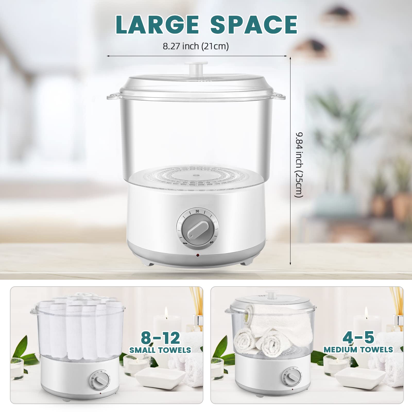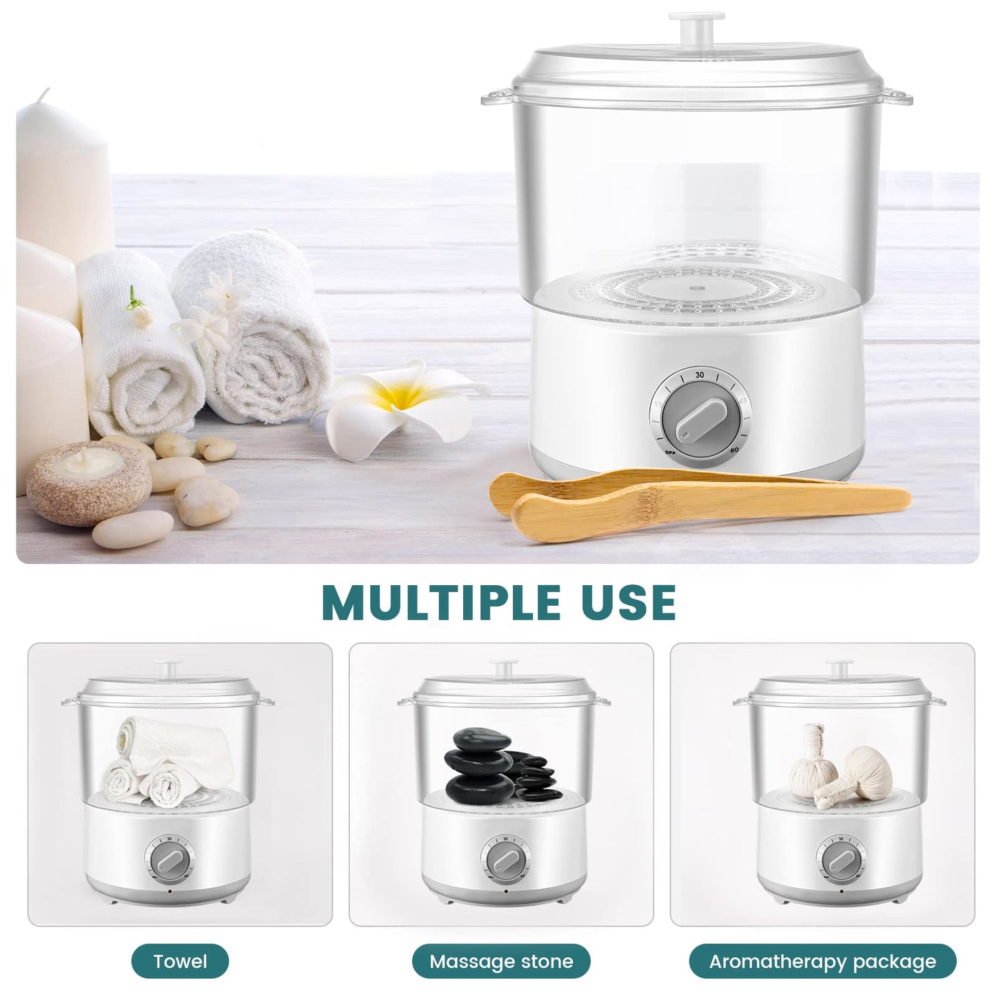 ["【Steam Disinfection】Towel warmer with high-temperature steam can quickly and thoroughly sterilize towels. There are no dead ends. Most harmful bacteria are eliminated without the use of chemicals. Towels are more hygienic and healthier for our skin after steaming.","【Fast Heating】The temperature of the towel steamer can reach up to 202 °F within 10 minutes. It only takes about 5 minutes to generate steam with full 500ml of water. With a towel warmer, towels, massage stones, incense sticks, etc. can be heated and sterilized.","【Timing Function】The electric towel warmer has a timer setting. You can set the cooking time in advance to avoid overheating. For added protection, it automatically switches off when there is no water. It is very safe and efficient.","【Easy to Clean】The cosmetic towel warmer is removable and therefore easy to disassemble and clean. It also features a clip that can catch hot towels. It can heat towels and massage stones (5 minutes standard time) as well as aromatherapy packs (5-8 minutes).","【High-Quality Material】The spa towel warmer is made of high-quality material and is durable and long-lasting. It is suitable for home use, beauty salons, hairdressers, gyms, etc."]