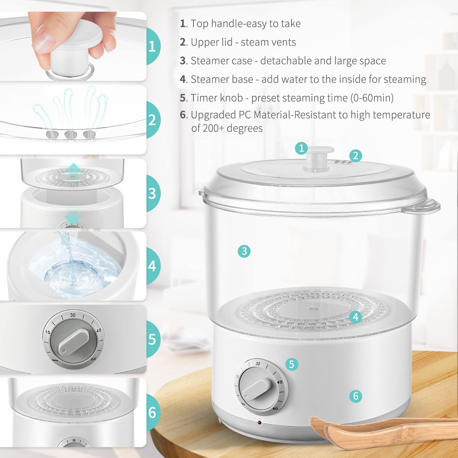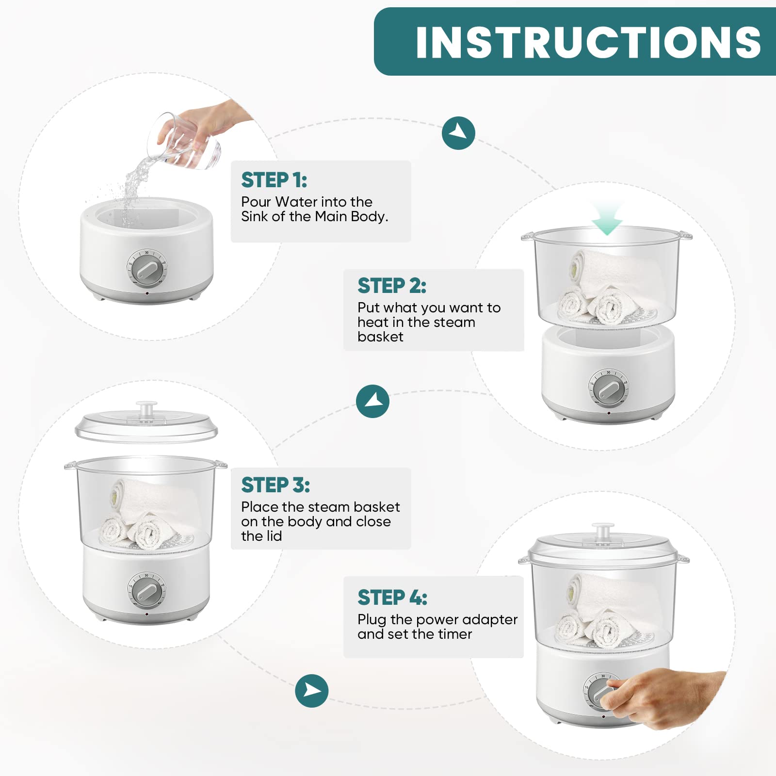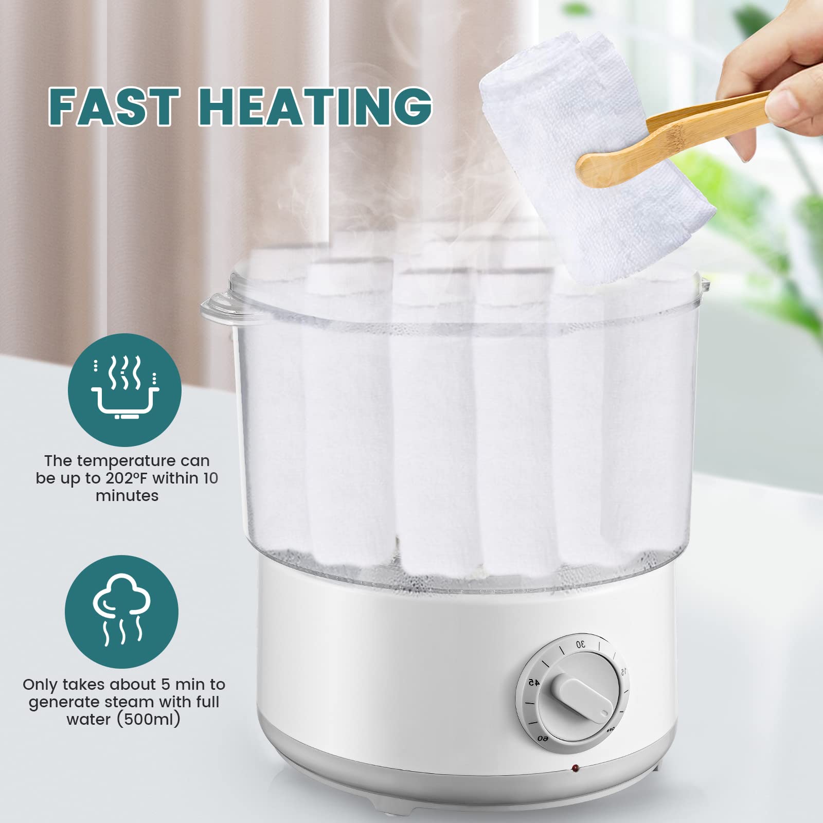["【Steam Disinfection】Towel warmer with high-temperature steam can quickly and thoroughly sterilize towels. There are no dead ends. Most harmful bacteria are eliminated without the use of chemicals. Towels are more hygienic and healthier for our skin after steaming.","【Fast Heating】The temperature of the towel steamer can reach up to 202 °F within 10 minutes. It only takes about 5 minutes to generate steam with full 500ml of water. With a towel warmer, towels, massage stones, incense sticks, etc. can be heated and sterilized.","【Timing Function】The electric towel warmer has a timer setting. You can set the cooking time in advance to avoid overheating. For added protection, it automatically switches off when there is no water. It is very safe and efficient.","【Easy to Clean】The cosmetic towel warmer is removable and therefore easy to disassemble and clean. It also features a clip that can catch hot towels. It can heat towels and massage stones (5 minutes standard time) as well as aromatherapy packs (5-8 minutes).","【High-Quality Material】The spa towel warmer is made of high-quality material and is durable and long-lasting. It is suitable for home use, beauty salons, hairdressers, gyms, etc."]