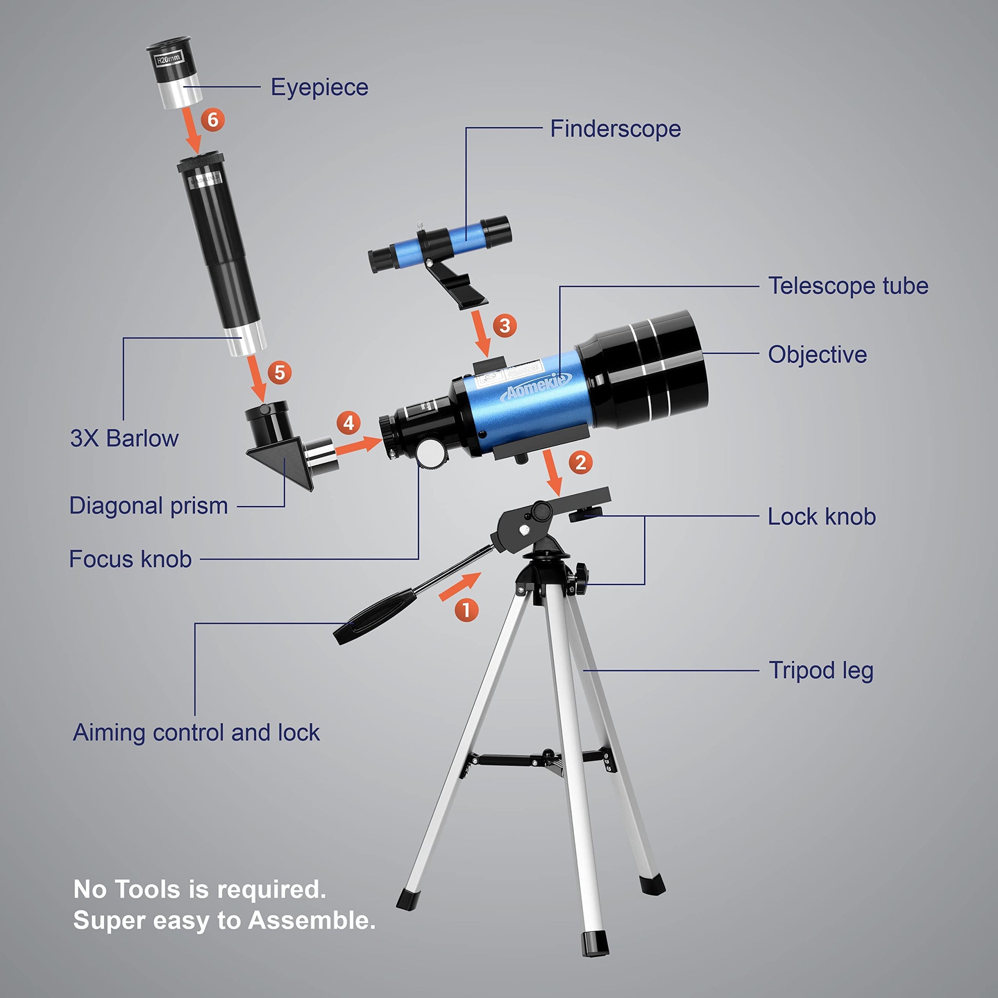 Astronomical Telescope Stars: Focal length: 300mm. Aperture: 70mm. Zenith mirror: 90 degrees. Magnification: 15X-140X, 6mm eyepiece for 50X, 20mm eyepiece for 15X. 3X Barlow lens increases magnification by 3X. The metal moon filter helps you see the moon more clearly.