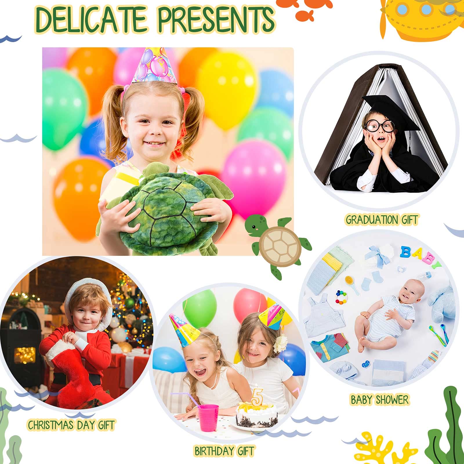 ["Product included: You will receive a 12-inch plush mama turtle and 4 pieces of small plush baby turtles; They are not only for entertainment but also as a gift for your friends for a lasting friendship; When you are far away, a cute plush squirrel can accompany your friends like you","Thoughtful Storage Design: Designed with a hidden zipper under the turtle shell, simply stuff 4 small plush baby turtles into the body of mama turtle and zip up; Whether you are traveling or at home, you don't have to worry about storage; Simply open the zipper and take them out when playing","Soft plush material: Made from high-quality fabrics, these sea turtle plush toys are designed to withstand endless playtimes, easy to clean with washable surfaces, so you just need to clean with soap, rinse in water, and then air dry","Cute gifts: These fabric turtle toys are lively, charming, and appeal to the taste of family and friends, allowing you to give them to your friends, family, and sea adventure enthusiasts for Christmas, Easter, Valentine's Day, birthdays, or other holidays","Wide use: These soft plush turtle animal toys can be used as sleep pillows, living room furniture decorations, play toys, throw pillows, animal-themed party decorations, rewards for school ocean activities, and more"]