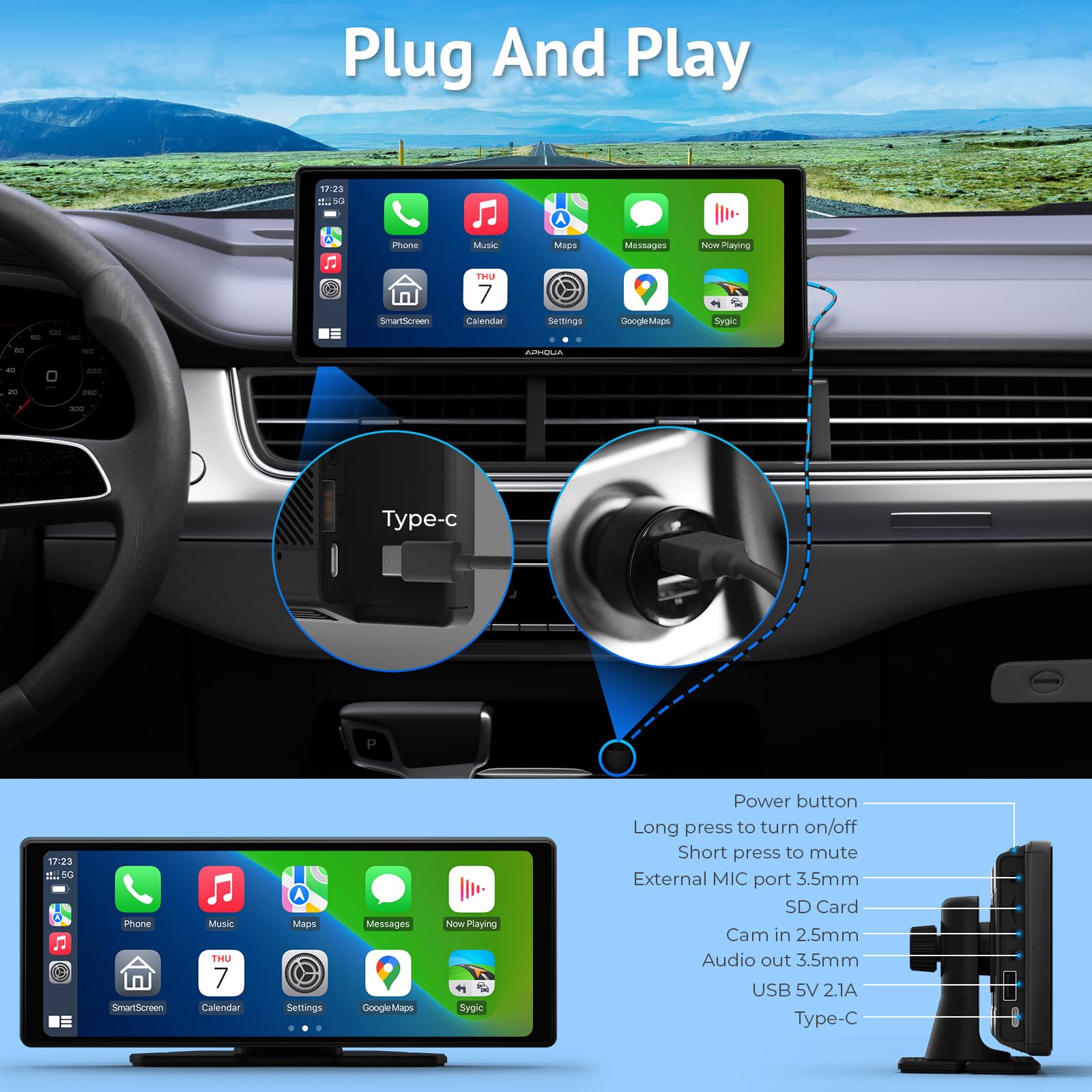 APHQUA Wireless CarPlay Display for Apple CarPlay and Android Auto, 9.3-inch portable light-sensitive touchscreen, digital media receiver with GPS navigation, Siri, MirrorLink/Siri/FM