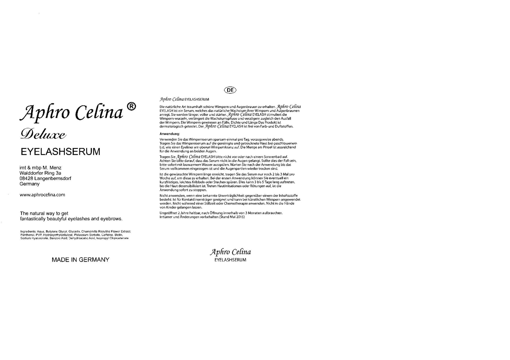 ["Aphro Celina Deluxe with Beautybox - Registered cosmetic product","The evolution of the classic Aphro Celina eyelash serum is here: Aphro Celina Deluxe","Your lashes will not only get longer, they will also look fuller.","The eyelash serum is dermatologically tested.","Apply once a day, like eyeliner, to the base of the lashes."]