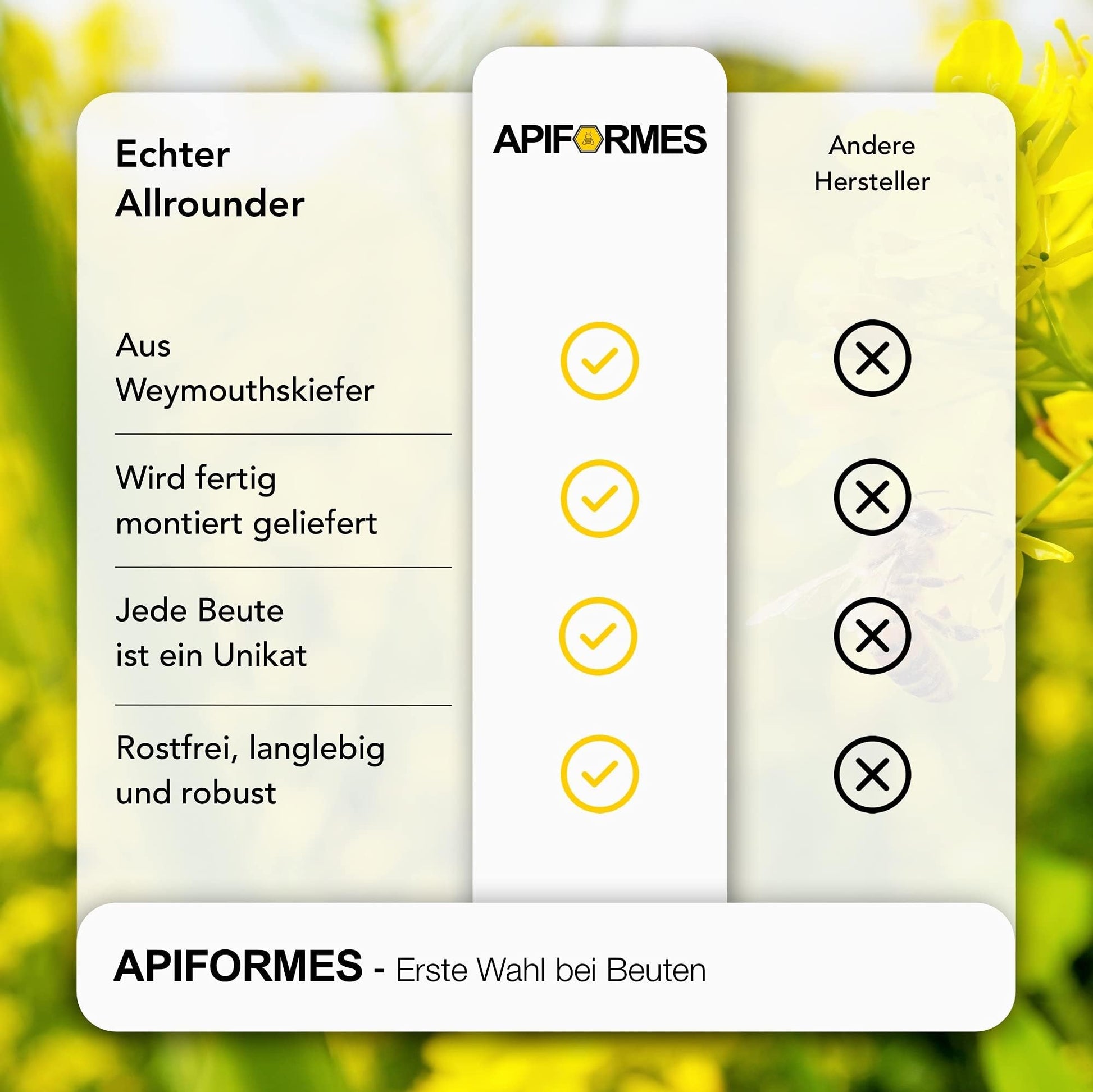 ABOUT US: APIFORMES is a young, ambitious family business that values customer satisfaction, happy bees, and sustainability. That's why our customers receive products from us that are of the highest quality and made from renewable wood. If you have any questions or problems, please feel free to contact us. We are happy to help you."