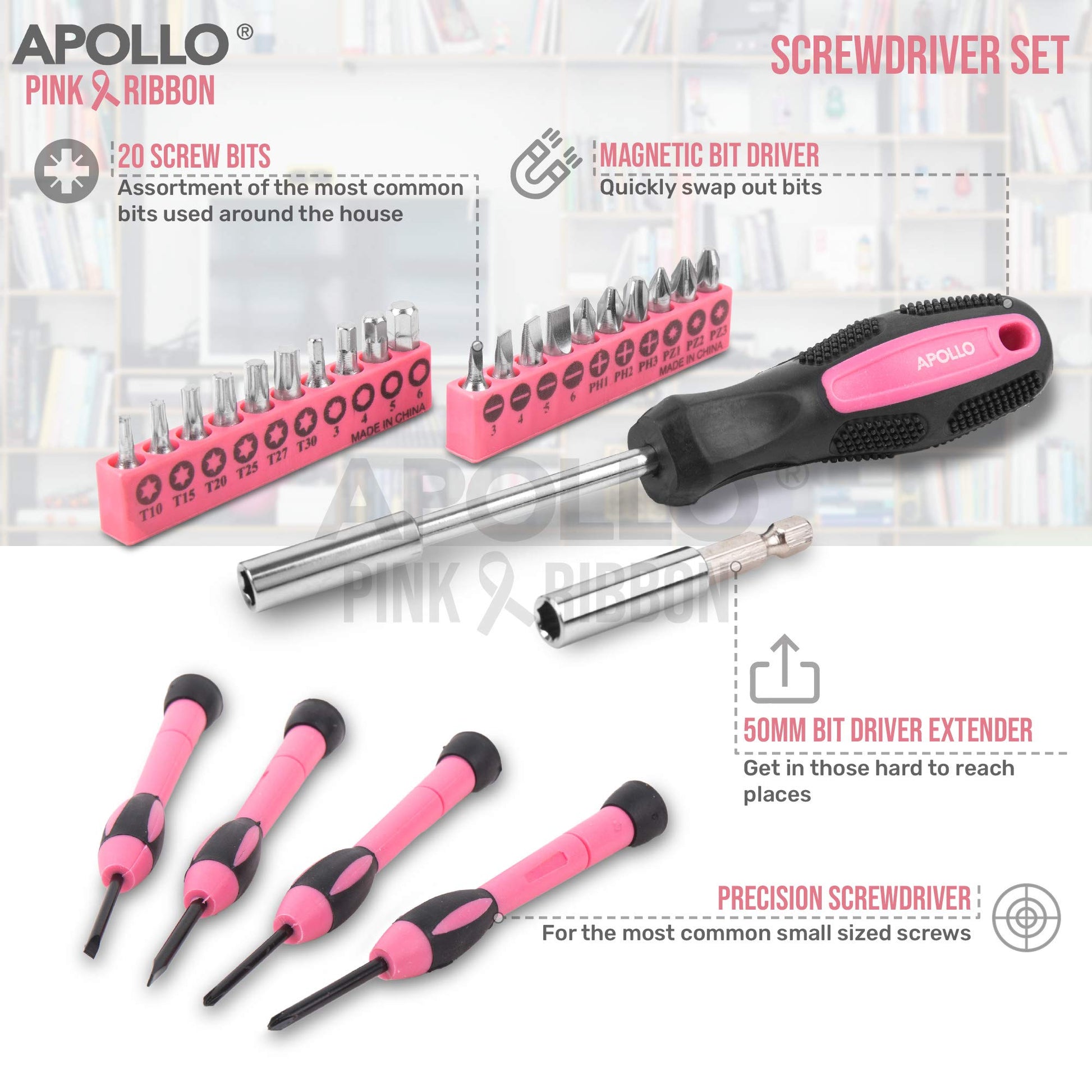 Apollo Pink Women's Tool Kit Small, 39-piece tool set for the household, tool kit set with tools in pink, including hammer and screwdriver set - Ideal gift for women.