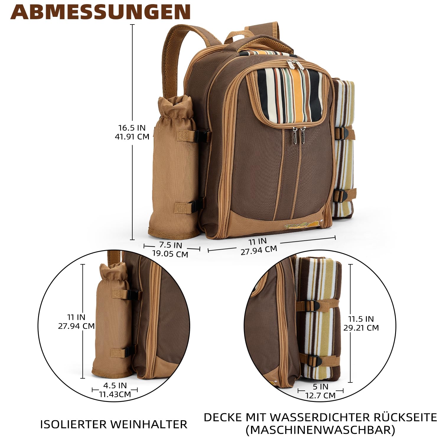 ["Spacious and temperature-controlled storage: Designed for 2 adults with a 15% larger insulated compartment (16.5in x 13.7in x 7in) than standard picnic backpacks","High-quality thermal lining keeps food fresh for over 6 hours - ideal for sandwiches, fruits, and chilled drinks. Includes a removable side cooler box (for 1-liter bottles) with a secure zipper and a waterproof fleece blanket (45in x 53in)","Complete picnic set: Includes stainless steel cutlery (2 knives/forks/spoons/plates), 2 wine glasses, 2 cotton napkins, 2 salt/pepper shakers, cheese knife, bottle opener, and a non-slip cutting board. Wine glasses with protective covers ensure safe transportation. All accessories fit in designated compartments","Ergonomic, adventure-ready design: Padded shoulder straps with breathable mesh fabric relieve back strain during hiking/camping. Two carrying options: top handle for quick access or backpack mode for hands-free mobility. Reinforced seams withstand up to 15lbs of weight","Weather-resistant solution for various scenarios: Leak-proof interior lining protects against spills on beach outings or park BBQs. Outer shell made of durable 600D polyester resists scratches"]