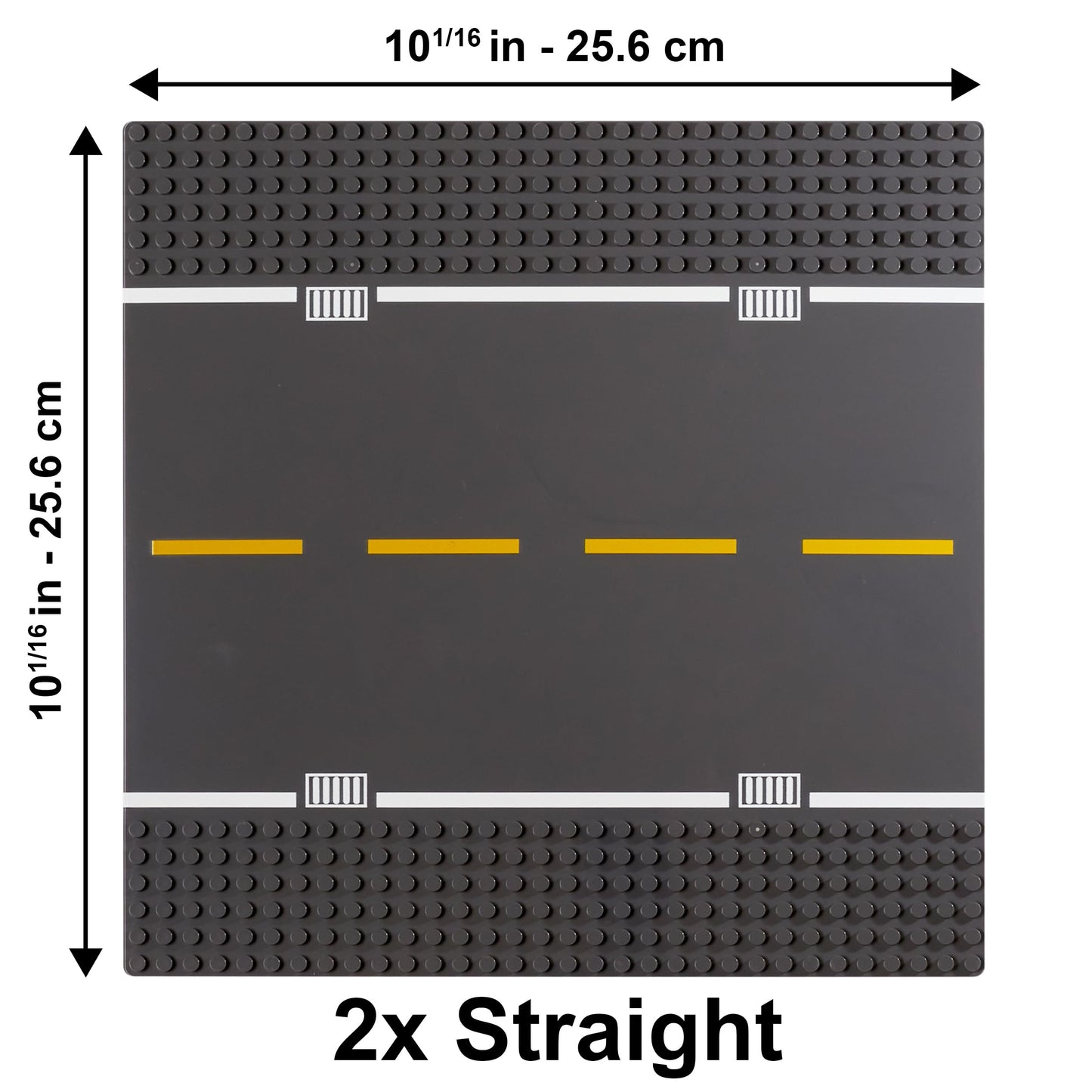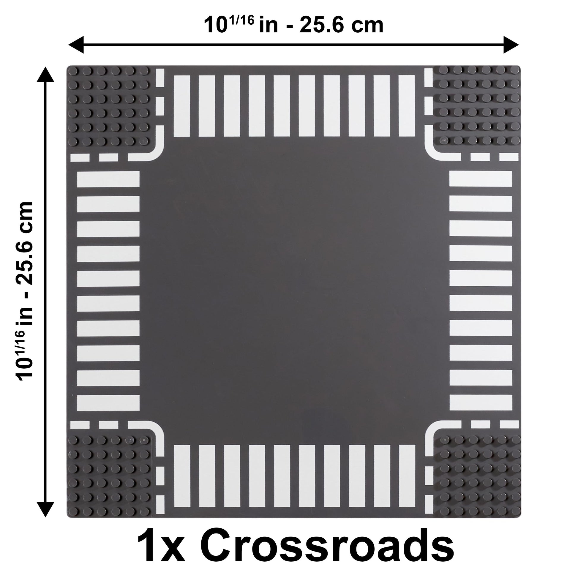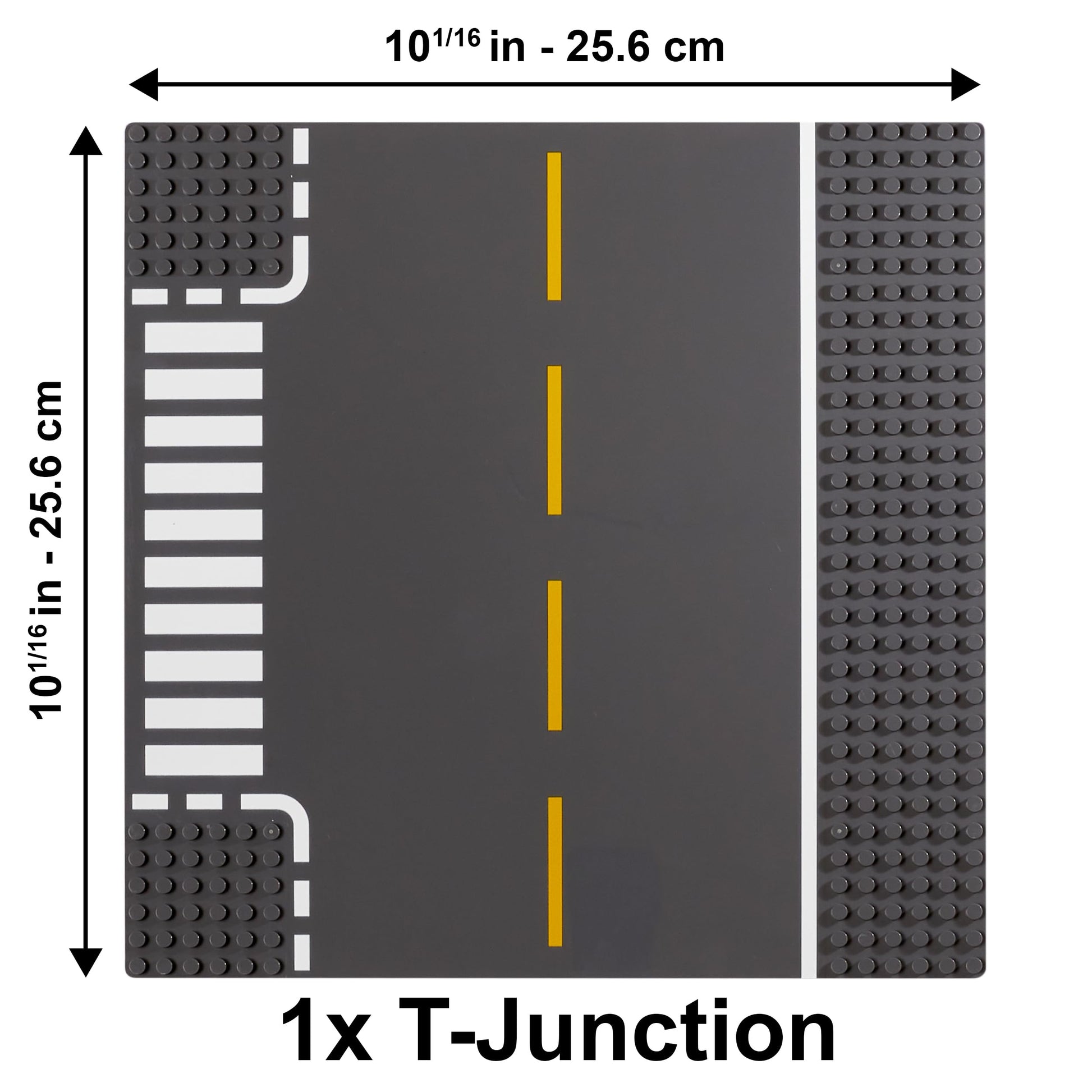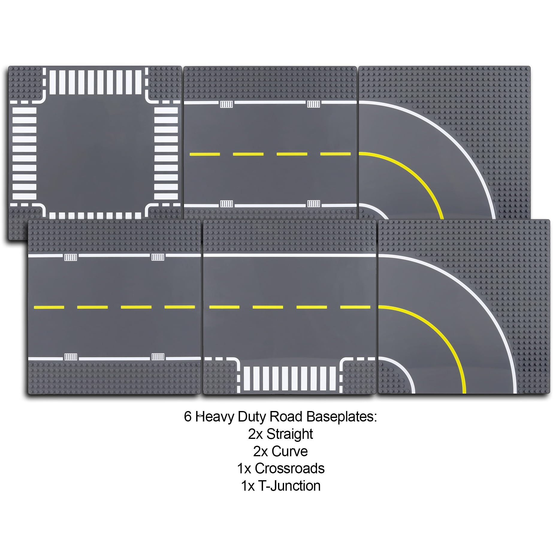 ["6 High-Quality Road Baseplates","VARIETY PACK: 2 Straight, 2 Curve, 1 Intersection, and 1 T-Junction Baseplate","SIZE: (10.08 inches x 10.08 inches, 32 studs x 32 studs)","TOP QUALITY: Durable, thicker, sturdy baseplates"]