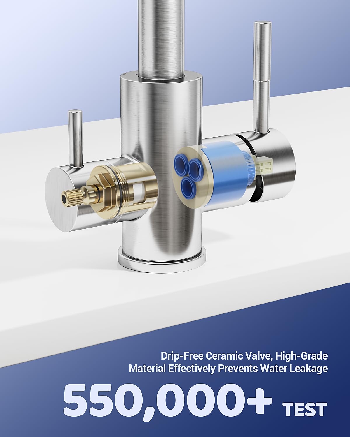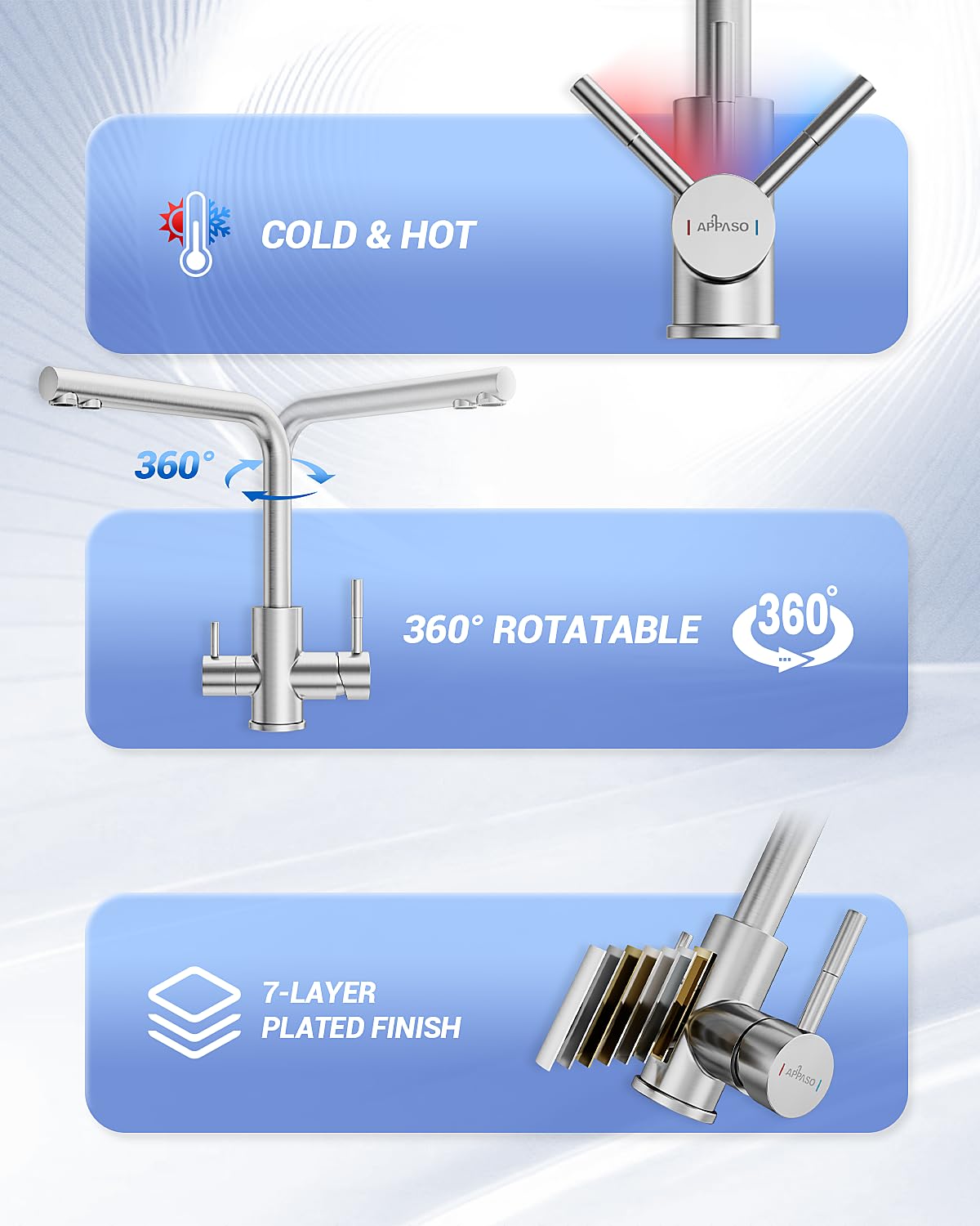 APPASO 3 Way Water Faucet, Kitchen Faucet 3 Way, 3 in 1 Kitchen Mixer Tap for Water Filter, Three Way Tap, Drinking Water Faucet with 2 handles, Stainless Steel Brushed Kitchen Sink Faucet.
