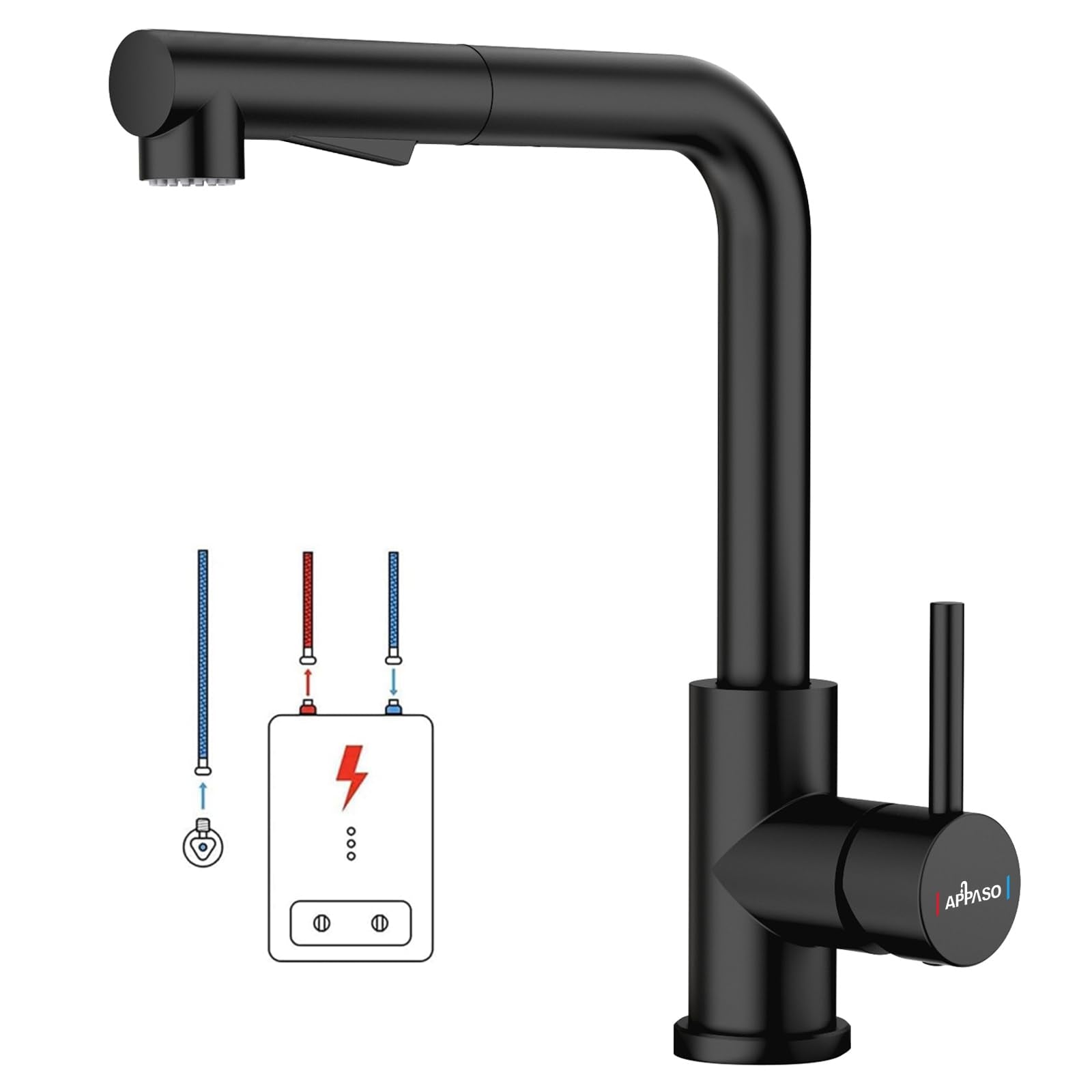 ["APPASO Standard Low Pressure Faucet Black】The low pressure kitchen faucet comes with 3 connections (3/8'), suitable for boilers and undercounter units. Food-grade PEX water inlet hoses are high temperature resistant, sealed and drip-free, deformation-resistant.","【Flexibility & Freedom of Movement】The low pressure mixer tap has a spray head that extends to 50 cm and can cover the entire sink. The high spout swivels 360° for a wide range of movement in and around the sink, providing enough height to fill and clean your largest pots and tallest pitchers. Suitable for single and double sinks. The single handle is easy to use, allowing you to easily adjust the temperature and water flow.","【Meets Different Needs】APPASO kitchen low pressure faucet-2 modes: stream for daily cleaning, powerful spray for heavy-duty cleaning. We provide an enhanced spray mode for faster cleaning. It effectively prevents splashes and saves 40% to 60% of water.","【Healthy Materials & Durable Quality】APPASO low pressure kitchen faucet is made of 304 stainless steel, 100% lead-free and nickel-free. The faucet's surface has been treated with multiple layers of materials that do not rust, making maintenance easier, preventing stains, simply wipe it with a cloth to reduce your cleaning time. Premium ceramic cartridge has undergone numerous tests, no leaks, less abrasion, more durability and longer lifespan.","【No Need for a Plumber】Installing the APPASO low pressure sink faucet only takes about 20 minutes. Refer to the included instructions for details. Detailed installation videos are also available. 24-hour online customer service. If you encounter any problems with the accessories you are using, feel free to send us an email. We will provide you with new accessories."]