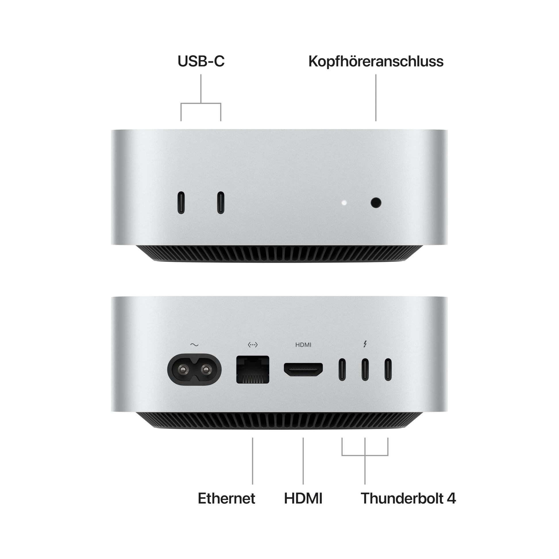["BIGGER IN SMALLER. - The much more powerful, much smaller Mac mini desktop computer: 5 x 5 inches, packed with power for you. It was designed around the Apple chip to maximize the speed and potential of the spectacular M4 chip. With convenient ports on the front and back.","LOOKS SMALL. PERFORMS BIG. - The Mac mini is only 5 x 5 inches small, fits perfectly under a monitor, and can be placed almost anywhere.","CONVENIENT CONNECTIONS - Use Thunderbolt, HDMI, and Gigabit Ethernet ports on the back and, for the first time, USB-C ports and a headphone jack on the front.","WITH THE POWER OF THE M4 - The powerful M4 chip delivers spectacular performance, making everything feel fast and smooth.","SUPER FAST APPS THANKS TO APPLE CHIPS - All your essential apps, including Microsoft 365 and Adobe Creative Cloud, run lightning-fast on macOS.*","LOVE YOUR IPHONE? YOU'LL LOVE THE MAC. - The Mac works seamlessly with your other Apple devices. Copy content on your iPhone and paste it on the Mac. Send text messages with Messages or answer FaceTime calls with your Mac.*","CO₂ NEUTRAL - The Mac mini is CO₂ neutral. More information on Apple's environmental commitment at apple.com/de/2030.","LEGAL DISCLAIMERS - This is a summary of the main product features. More information is available below."]