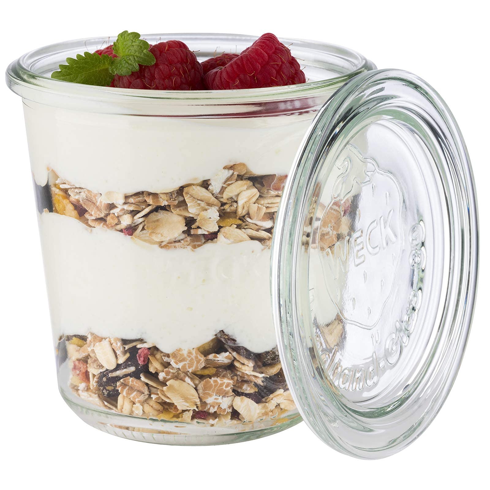 ["π THE BRAND: Behind the brand APS is a German traditional company that has been producing gastronomy and serving items for decades. The family business is now in its fourth generation. APS distributes products worldwide in the buffet, tabletop, and bar areas.","π VERSATILE: WECK jars have been a staple in every kitchen for over 100 years. The Weck jar has evolved into a true multitasker: for presenting, decorating, storing, freezing, sustainable packaging, decorative storage, serving desserts, cakes, and other dishes, and many other great purposes.","π MATERIAL: This set of 6 Weck jars consists of 6 tulip-shaped jars and 6 glass lids.","π SPECIFICATIONS: The jars have a diameter of 3.5 inches and a height of 3.5 inches. They have a capacity of 290 ml each.","π CLEANING AND USAGE: All jars are dishwasher safe, oven safe, and microwave safe. They are temperature resistant from -22Β°F to 356Β°F."]