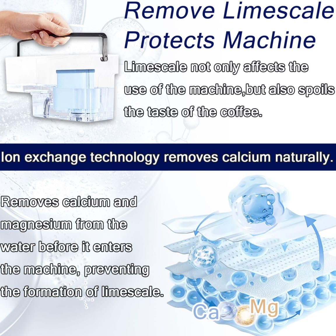 "Ion-exchange-Technology: Contains a large amount of natural coconut shell activated carbon and polymer resin. Naturally removes calcium and magnesium, significantly improving water quality, hardness, and taste. Also removes calcium from the water before it enters the coffee machine to prevent the formation of limescale deposits and reduce the frequency of water filter changes.",