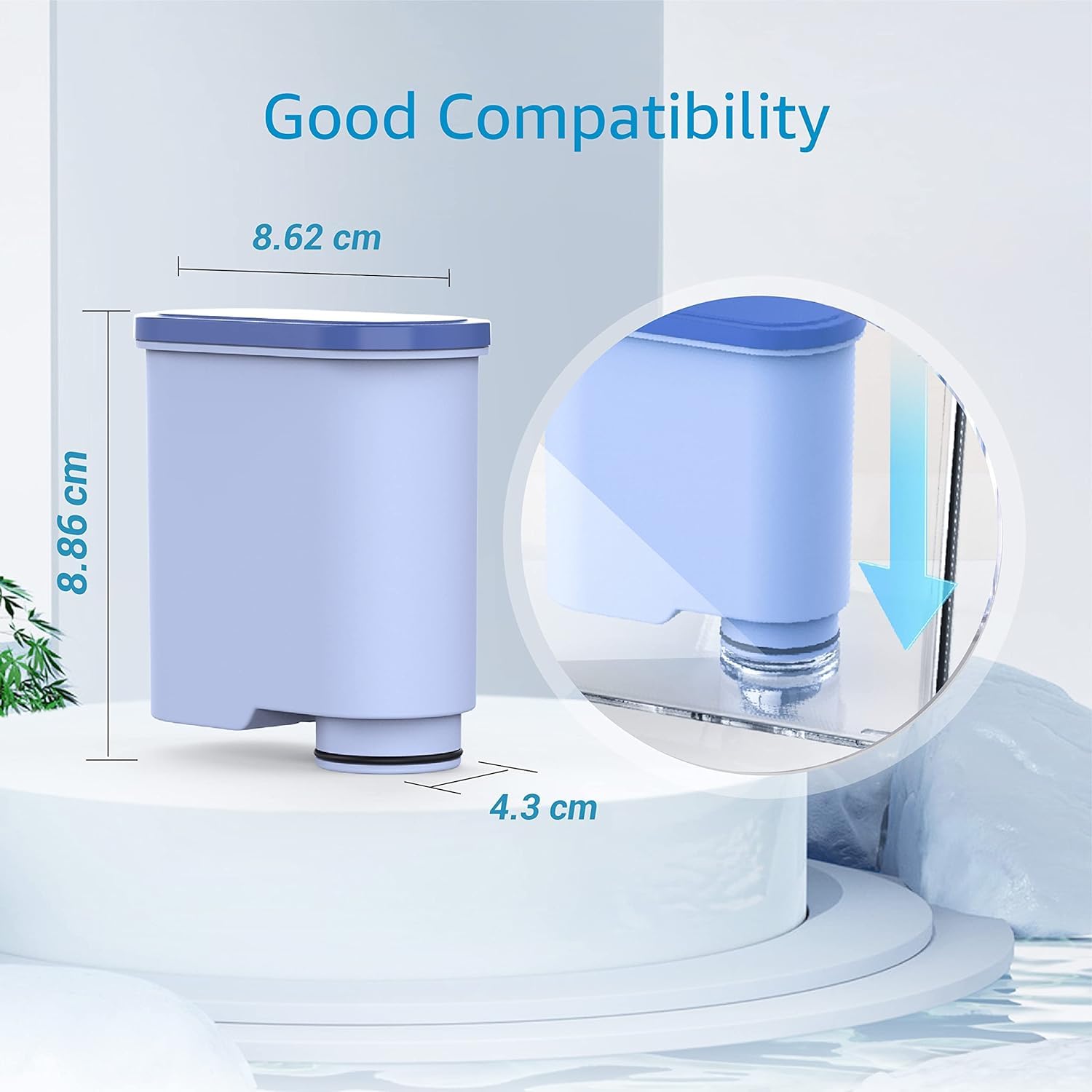 ["[Authoritative Certification] This filter has passed the authoritative TÜV SÜD certification for the safety of BPA-free materials and can effectively reduce chlorine and odor in water.","[Efficient Filtration] Made from high-quality materials such as natural coconut shell activated carbon and ion exchange resin, this filter can efficiently reduce chlorine, rust, lime, and deposits based on tests by a third-party laboratory, ensuring the purity of drinking water to the highest degree and improving water taste.","[Long Lifespan] This filter has a long and stable filtration performance. To ensure efficient filtration, it is recommended to replace the filter when the filter capacity reaches 150 liters.","[Good Compatibility] This filter is very easy to install, without the need for tools. With its exquisite design, this filter has good compatibility and allows you to enjoy fresh water with ease.","[Compatible Model] Replacement for espresso machines with Aqua Clean Filter CA6903/00, CA6903/10, CA6903/22, CA6903/99, CA6903-00, CA6903-01, CA6903-99, CA6903 cartridges.","[Filter Replacement Reminder] The visual time window on the cap allows you to monitor the filter's lifespan in real time and remind you to replace it in a timely manner. Note: Soak the filter in water before use to ensure that the filter is fully submerged in water for a few minutes until no bubbles are present."]