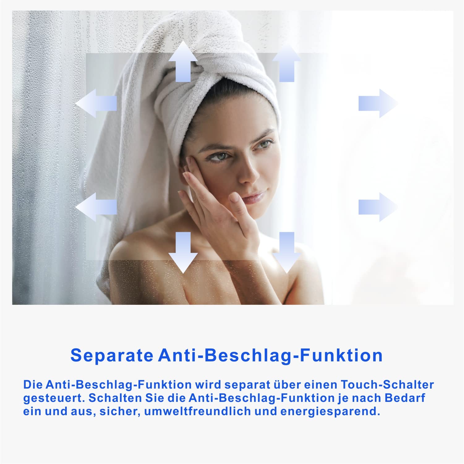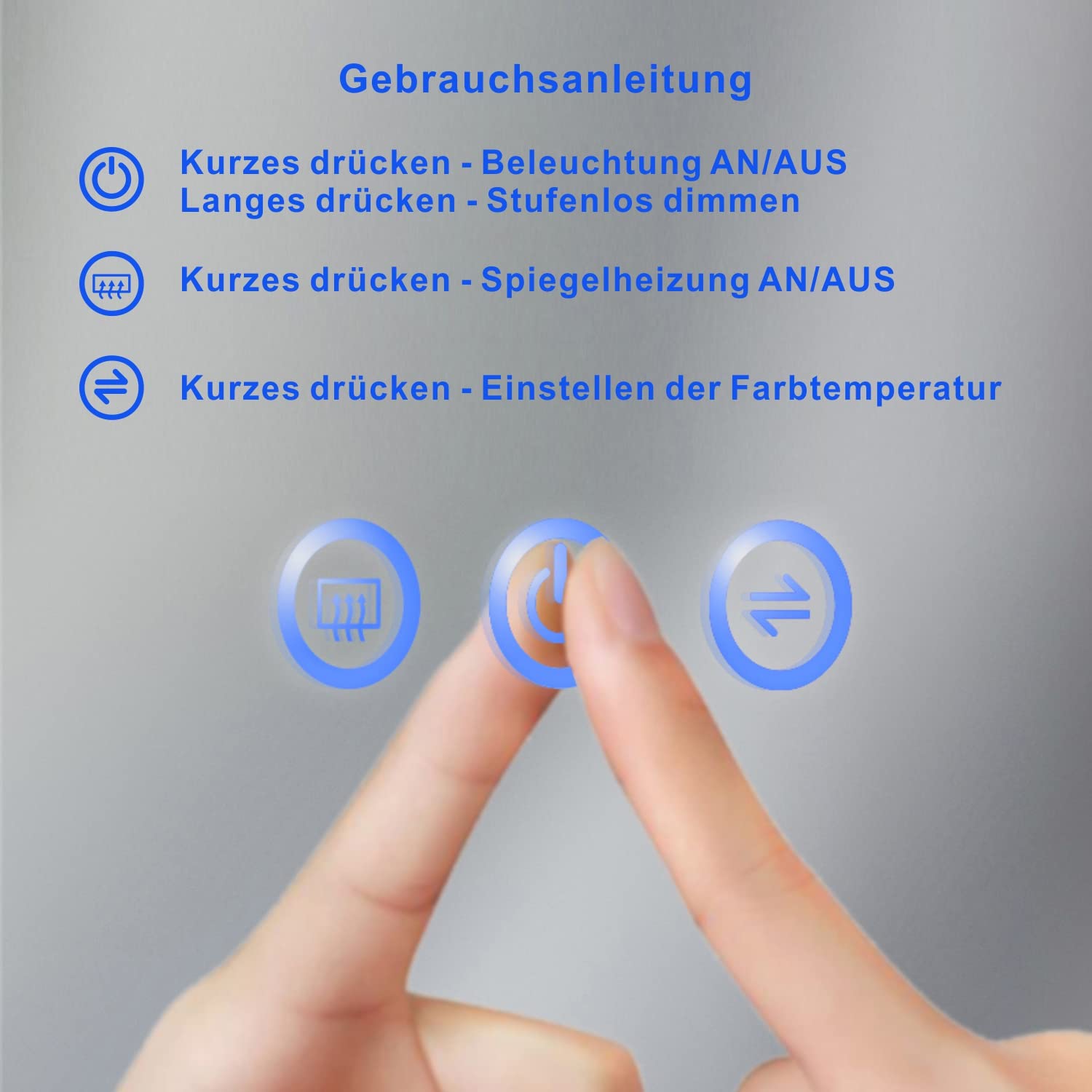 ["【3 Light Colors Adjustable】Our LED bathroom mirror has 3 light colors: Warm White 3000K, Neutral White 4500K, Cool White 6400K. This mirror is sufficient as room lighting to create a cozy atmosphere in bright or warm light, depending on your preferences.","【Dimmable Function】The LED lighting is dimmable. You can use the mirror not only for your morning or evening routines in the bathroom in pleasant light, but also create a mood-setting light with the dimming function.","【Memory Function】The dimming status can be saved even when the power is off, so our bathroom mirrors can be connected directly to an existing power source (e.g. a ceiling light) and turned on and off via a wall switch.","【Separate Anti-Fog Function】The flat heating film is applied directly to the back of the mirror and is controlled separately via a touch switch. Turn on and off the anti-fog function as needed, safe, environmentally friendly and energy-saving. Please note: The anti-fog function is only effective in the central part of the mirror and cannot cover the entire area of the mirror, i.e. only the central part of the mirror is fog-free.","【High-Quality Materials】Mirror made of 4mm crystal glass with polished edges. Support frame made of silver matte anodized aluminum. For environmental protection, the use of copper and lead during the manufacturing process of our mirrors has been completely avoided.","【Easy Installation】The installation of our LED bathroom mirrors is very simple. Simply attach the wall bracket to the wall with screws, connect the mirror to the power cable, and finally hang the mirror on the wall bracket. The required mounting accessories are included. Does not include a plug."]