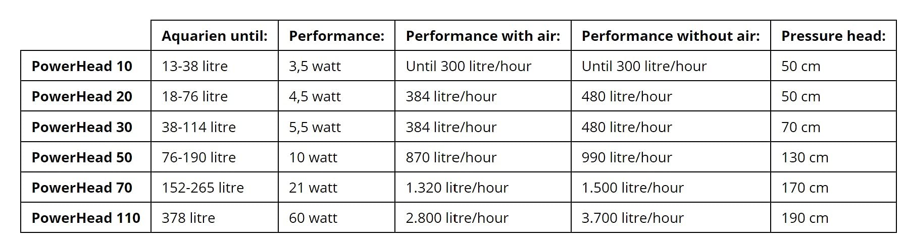 "Power: 21 watts","Power with/without air: 1320 / 1500 l/h (Reverse flow up to 600 l/h)","Head height: 170 cm","for aquariums from 40 to 70 gallons"