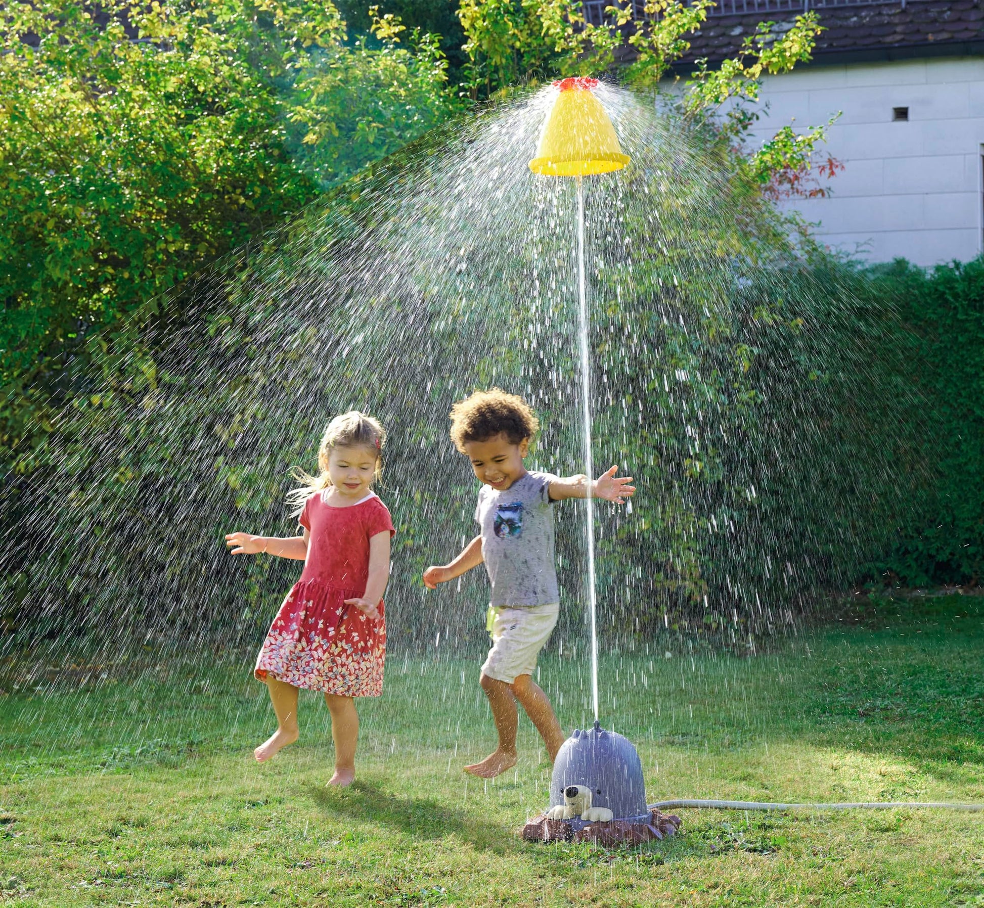 "Adjustable nozzle - The water jet can be manually fixed, so that the little hat flies up like a rocket and the kids can hop and jump through the water shower.",