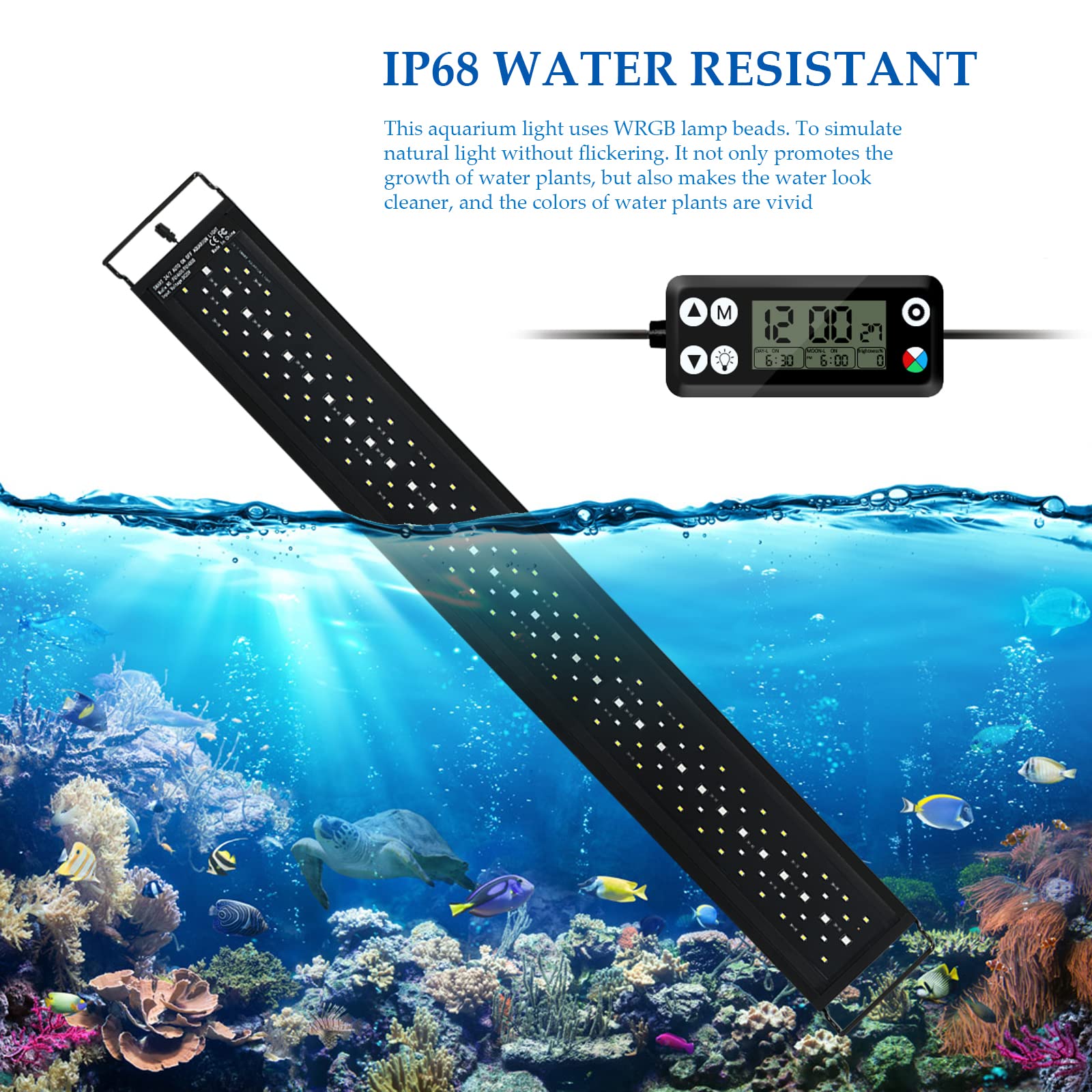 ["ENHANCED HIGH-QUALITY LED LIGHT: This aquarium light uses WRGB lamp beads. The three primary colors are scientifically adjusted to simulate natural light without flicker. It not only promotes the growth of aquatic plants, but also makes the water look sparkling clean and the color of the aquatic plants lifelike. Suitable for freshwater fish and aquarium plants.","THREE PROGRAMMABLE USAGE MODES: The DIY mode has 8 time periods covering 24 hours. Start time, end time, light color, and brightness of each period can be freely adjusted to your liking. The brightness of the white light in the daytime mode can be set from 10% to 100%. The light color of the night mode can be set to red, orange, yellow, green, cyan, blue, and violet. The daytime mode and night mode can be freely set.","GOOD WATERPROOFNESS AND HEAT DISSIPATION: Optimized lamp body design. Fully sealed process protects the device from moisture and water ingress, IP68 waterproof rating, no fear of splashes or accidental immersion in water. The 1.2mm premium aluminum housing provides more effective heat transfer, no fan and no low-voltage DC adapter, safe use and energy saving.","PROGRAMMABLE DESIGN WITH LCD MONITOR: The controller has a clock to keep track of the time for the 24-hour settings. When the time is up, the light will automatically turn on or off. You can see the current time, mode, running start time or running end time, current light color and brightness on the LCD display.","Comes with everything you need: 1 x LED light with controller, 1 x adapter, 2 x adjustable metal brackets, 1 x user manual. The 36W aquarium light has 158Pcs LED beads, including 76 white lamp beads, 11 red lamp beads, 8 green lamp beads, 31 blue lamp beads, and 32 RGB lamp beads."]