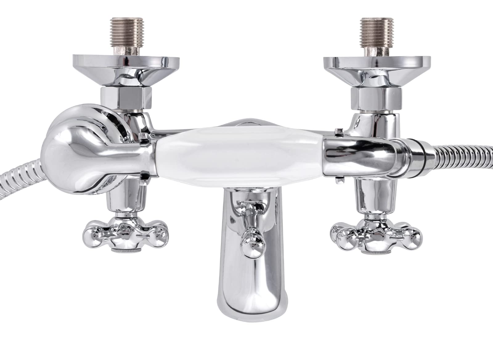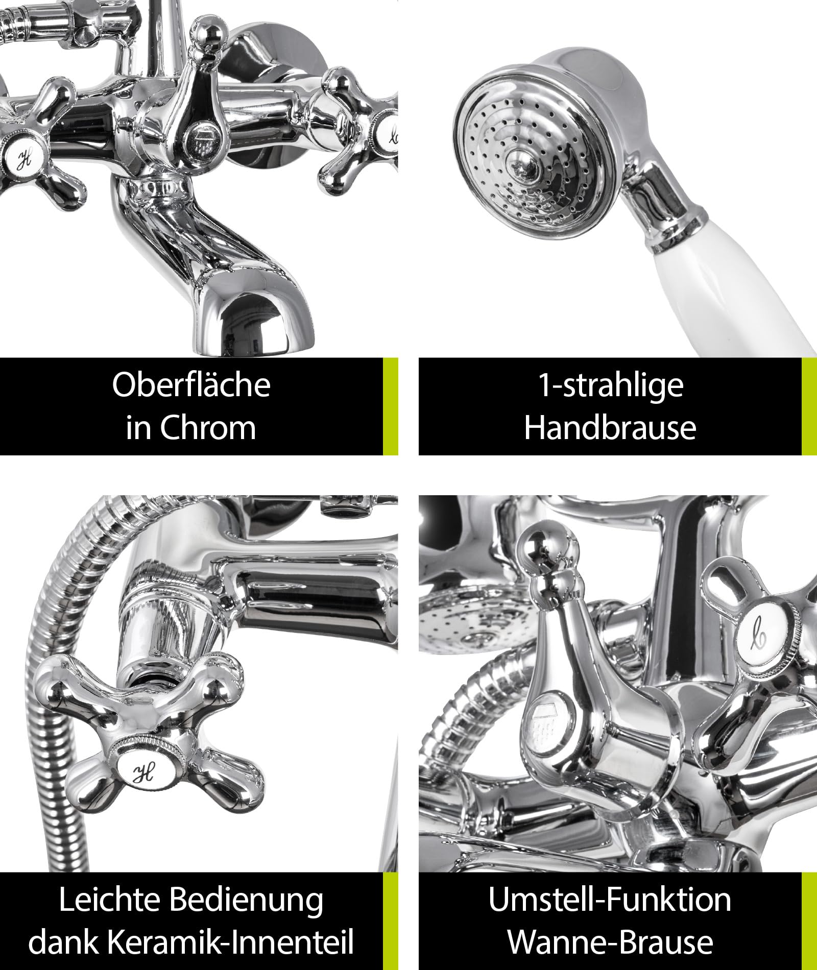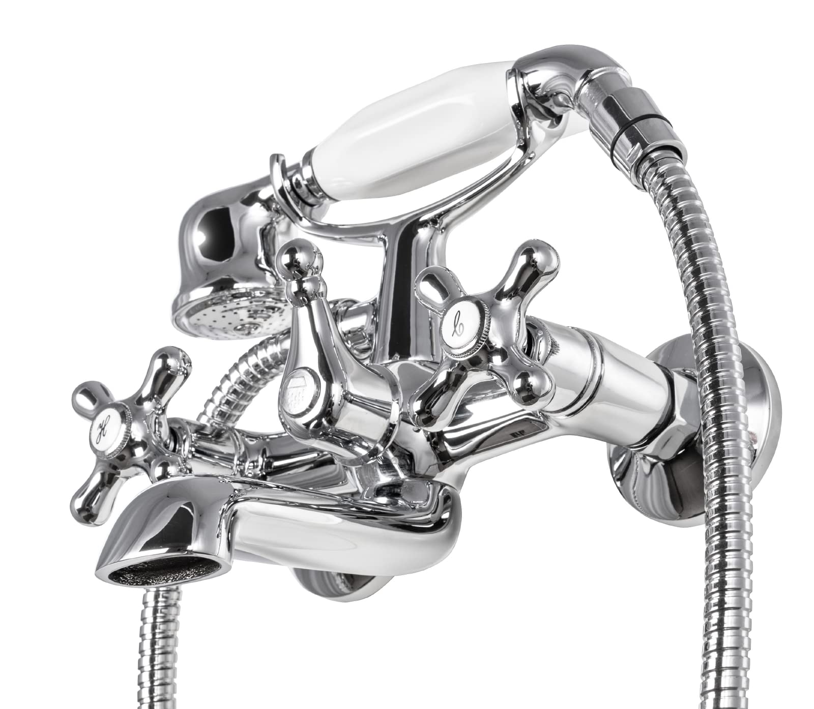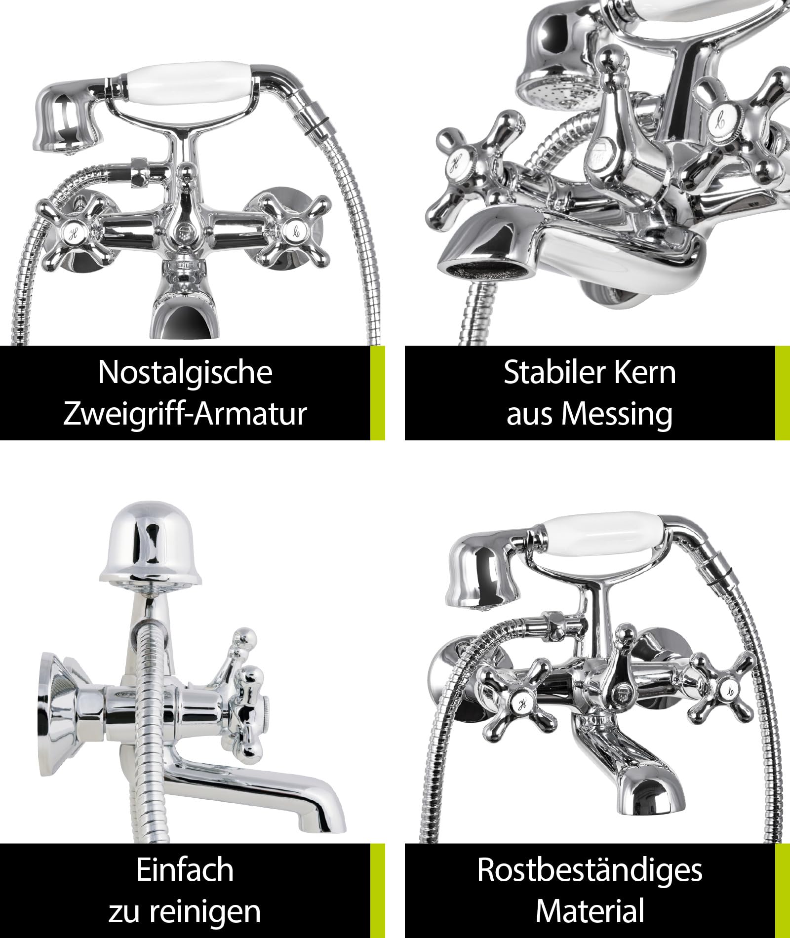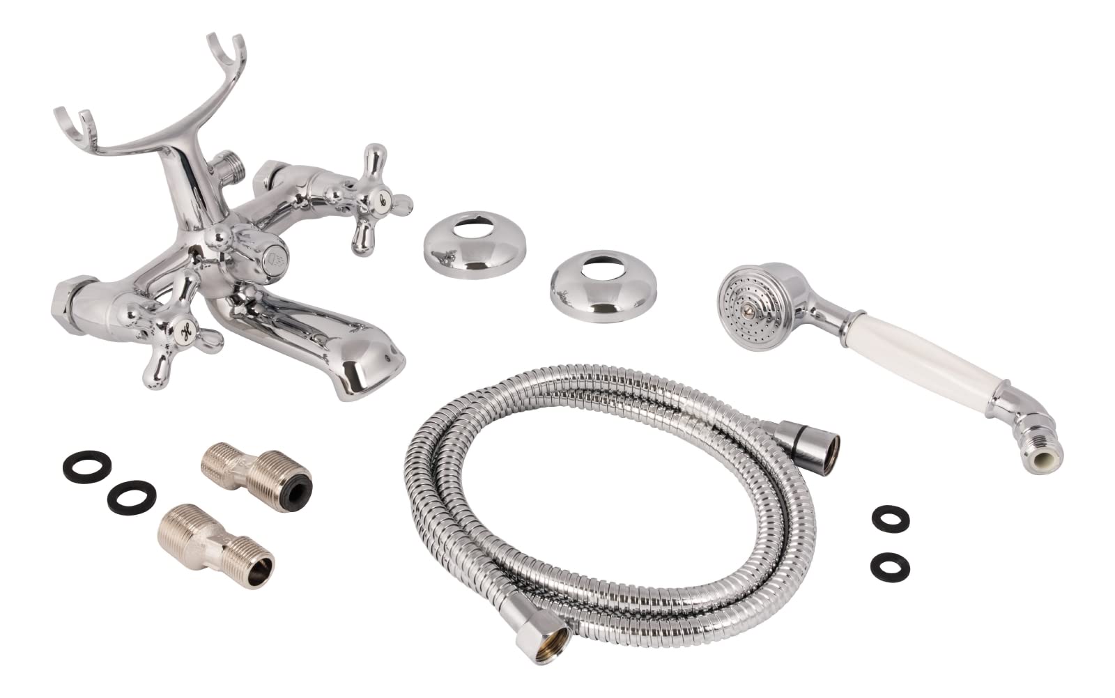 ["➤ ATHENAS TWO-HANDLE MIXER: • For bathtubs • Cross handles • Ceramic cartridges • With nostalgic hand shower • Practical diverter function • Chrome-plated • Concealed S-connections • Including mounting materials","➤ NOSTALGIC STYLE: This two-handle mixer combines playful shapes and a nostalgic design. A special highlight of the faucet in elegant chrome finish are the finely crafted cross handles for temperature control. Immerse yourself in a special atmosphere with this piece!","➤ DIVERTER: Whether the flexible shower or the faucet - thanks to the regulator on the faucet, you can easily switch between the two options and decide where the water flows. For added safety, a small drawing on the ceramic decor helps guide you.","➤ EASY OPERATION: The faucet is equipped with cross handles. These facilitate operation and ensure comfortable water regulation and long product durability!","➤ INSTALLATION: The faucet features a ½ shower outlet for the included shower hose. To start installation immediately, the package also includes mounting and connection materials."]