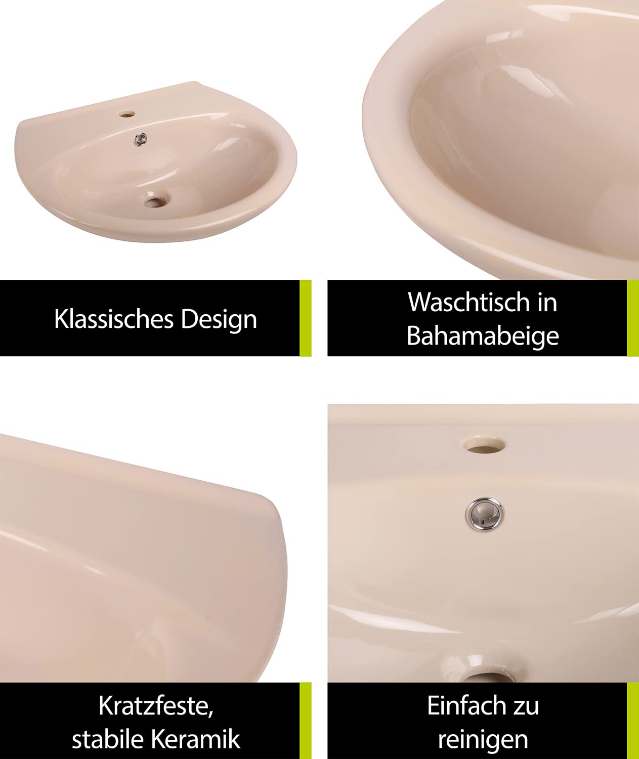 ["➤ BEIGER WASCHTISCH: • Halbrund • Sanitärfarbe Bahamabeige • Stabile Keramik • Hahnloch • Verchromter Überlauf • Maßangaben: 23.62 x 19.69 inches • Ablage • Wandhängend • Porenfrei • Retro • Pflegeleicht • Robust • UV-beständig • Kratzfest","➤ NOSTALGIC DESIGN: The classic and timeless design will delight any nostalgia enthusiast. In warm Bahamabeige, this retro-style basin is a perfect addition to a bathroom design of the same color.","➤ EQUIPMENT: The washbasin already has a centrally placed tap hole that can be used for a faucet. In addition, there is also a chrome-plated overflow protection in the center, which prevents the basin from overflowing.","➤ PORE-FREE SURFACE: Dirt and bacteria have no chance to settle on the pore-free, smooth surface of the ceramic. This allows for quick and effortless cleaning of the sink.","➤ EFFORTLESS INSTALLATION: Easily attach the wall-hung basin to the wall. You will need two dowels to ensure a secure hold. The hole spacing for mounting is 11.14 inches."]