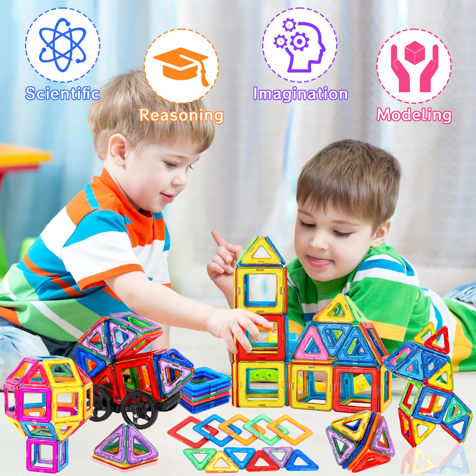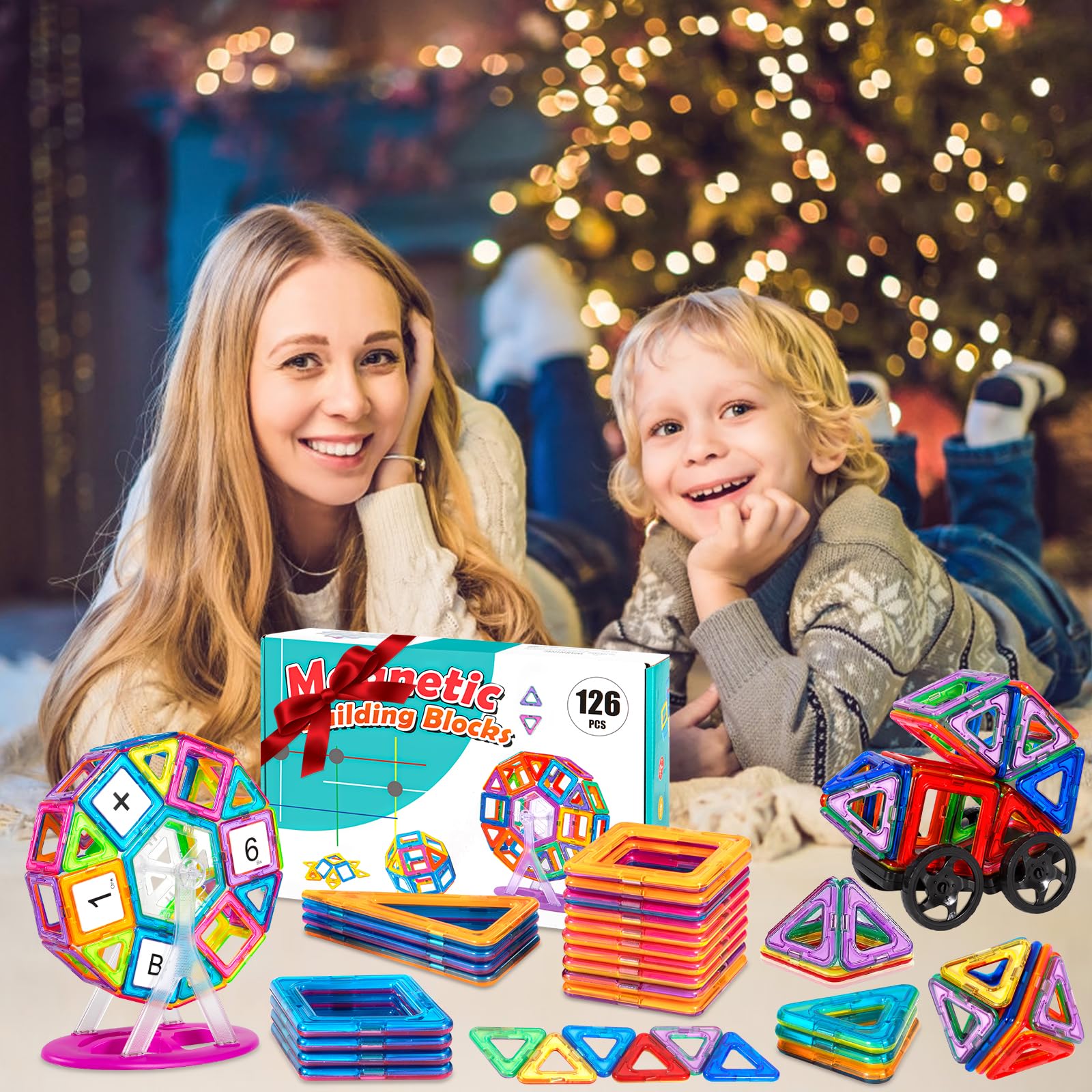 ["✨【126Pcs Magnetic Building Blocks Set】: This magnetic building set includes: 30 x Square, 22 x Triangle, 2 x Trapezoid, 4 x Parallelogram, 4 x Long Triangle, 6 x Semicircle, 1 x Ferris Wheel (including 8 accessories), 2 x Hexagon, 16 x Number cards, 26 x Letter cards, 4 x Wheel, 2 x Base plate, 1 x Manual. The magnetic building blocks come in a variety of different colors. The vibrant colors can inspire children to play, help children stay away from screens, and enjoy the fun.",