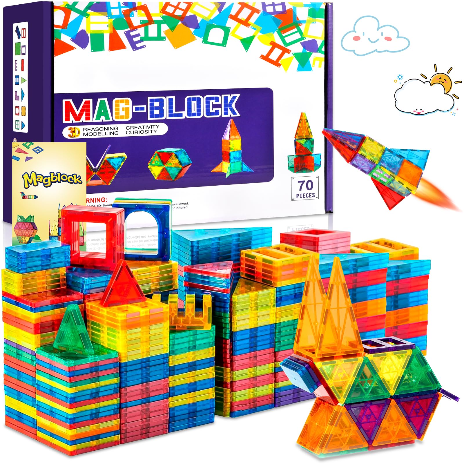 ["🌈🏰【Good quality】: The colorful magnetic building blocks are made of high-quality ABS material, durable, safe, and environmentally friendly, non-toxic and harmless. High transparency, good color quality, does not fade. With exquisite craftsmanship and strong sealing. The surface of the building blocks is smooth and burr-free, preventing children's hands from being hurt. Building toys for boys and girls aged 3 4 5 6 7 8 years old.","🌈🏰【70 pieces colorful building set】: This set includes 70 colorful magnetic building blocks in various shapes. Building blocks come in different shapes and colors, making it easy and fun to build. Children can unleash their imagination and creativity to build various DIY shapes and 3D models. Enjoy the fun of playing with magnetic building blocks for boys and girls aged 3, 4, 5, 6, 7, and 8 years old.","🌈🏰【Entertaining & educational】: While children enjoy the fun of the game. Help them improve shape recognition, color recognition, and mathematical skills. Transition from 2D to 3D style as the child grows. Promote the development of their brain, education, and spatial construction skills through their own explorations, so that children can benefit lifelong.","🌈🏰【Colorful magnetic building toys】: A rich color mix catches children's attention and enhances children's color perception. Stimulate children's imagination and creativity through playing shapes, improve hand-eye coordination, develop fine motor skills and creative thinking, and train children's problem-solving and practical skills. Help children stay away from screens of electronic devices.","🌈🏰【Family games】: Magnetic blocks can create a closer bond between you and your child. Accompany your children in their leisure time to enjoy the warm moments that magnetic building toy brings, so that children can feel the warmth of family and love for companionship. Perfect educational gift for boys and girls aged 3 4 5 6 7 8 years old."]