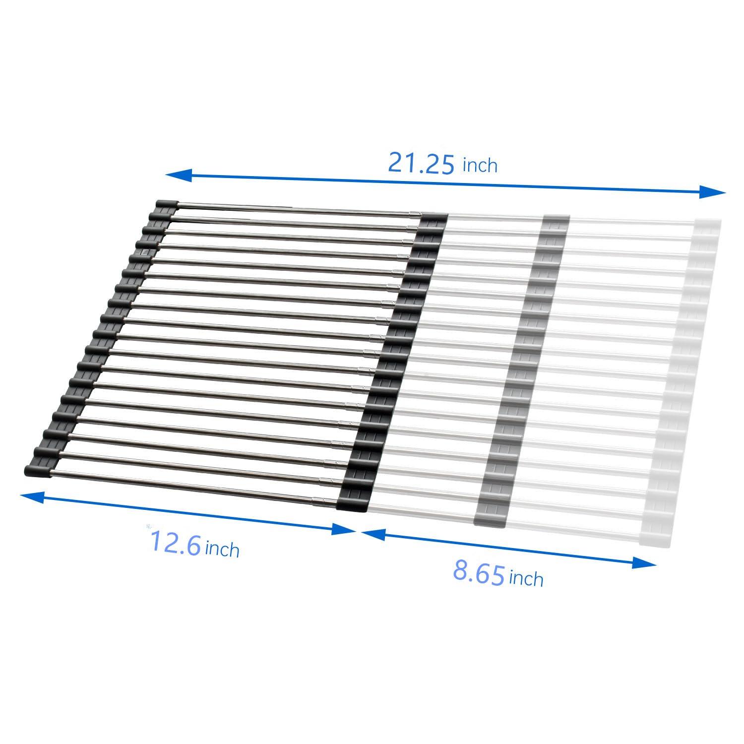 ARAIny Expandable Large Dish Drying Rack, roll-up heat-resistant drying rack for stainless steel sinks, collapsible over non-slip silicone rolling mat (18 stainless steel rods 54x33cm)