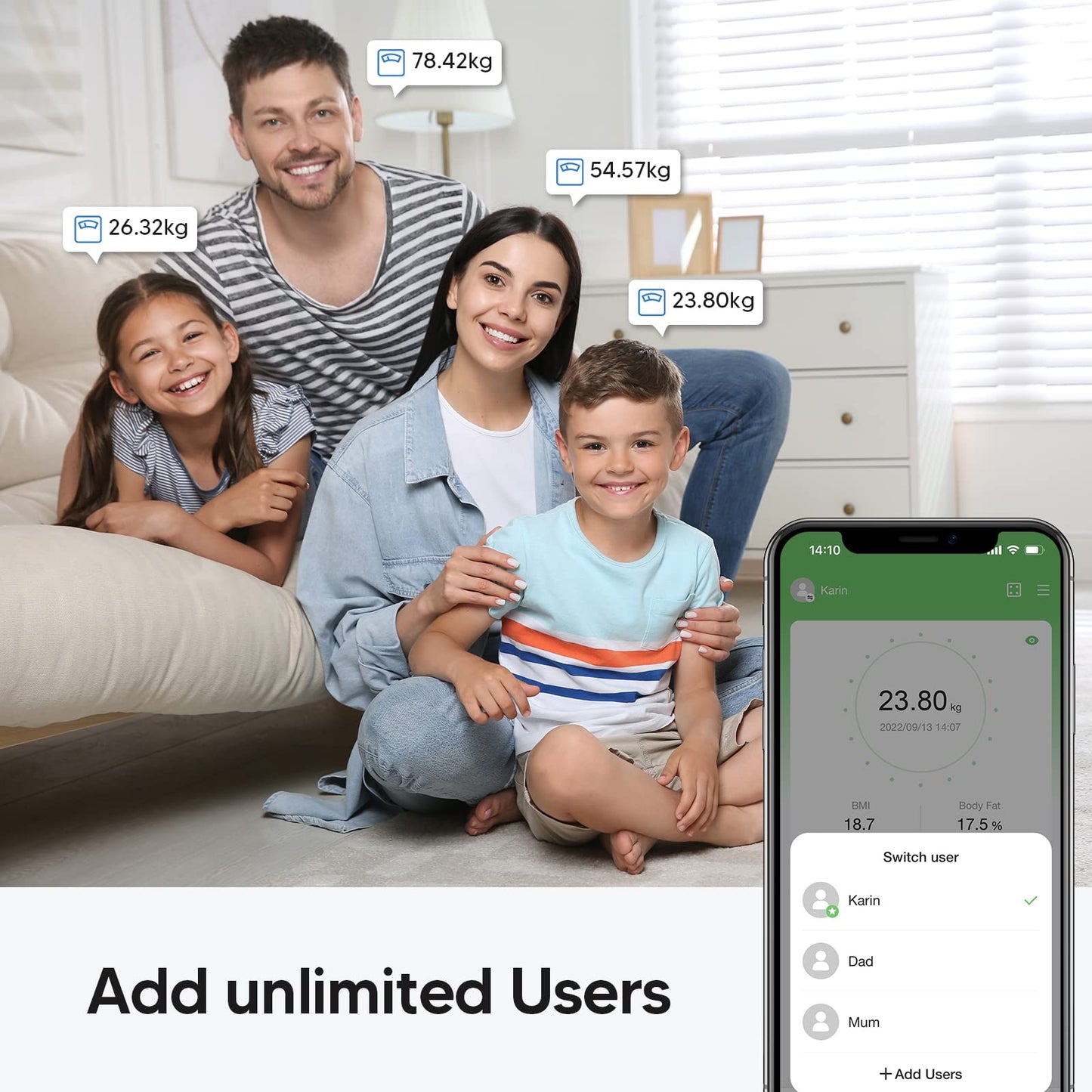 Bluetooth connection: arboleaf body analysis scale supports setting up to 8 custom profiles and automatically distributing data to the correct users. You can add your family's profiles to your account. Other users can also create their accounts individually through the app.