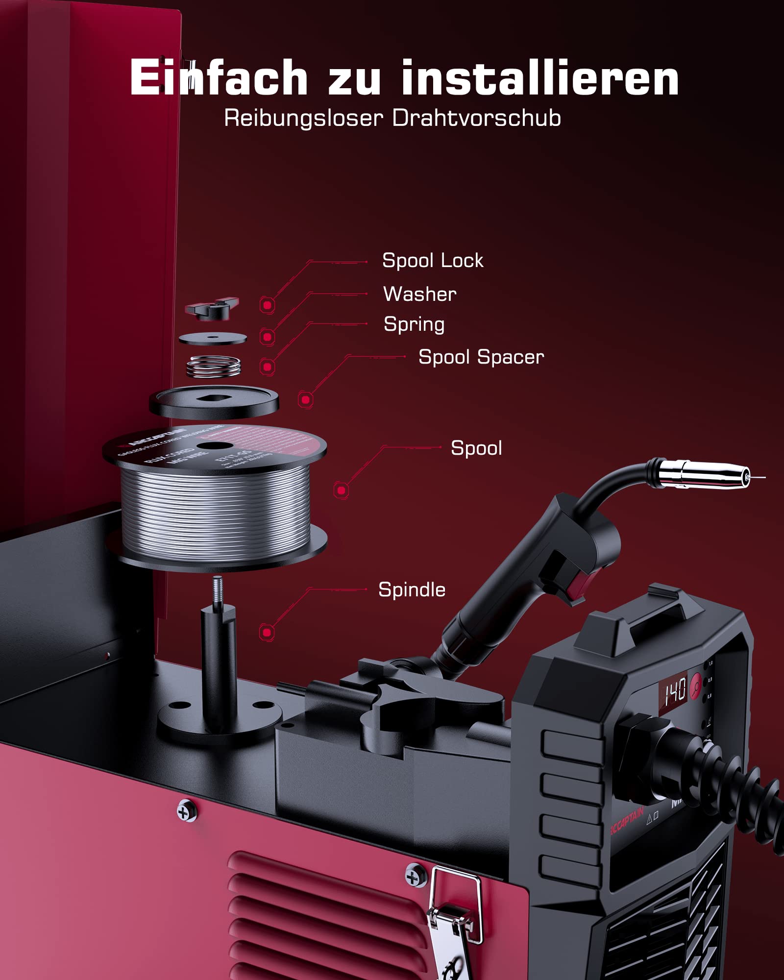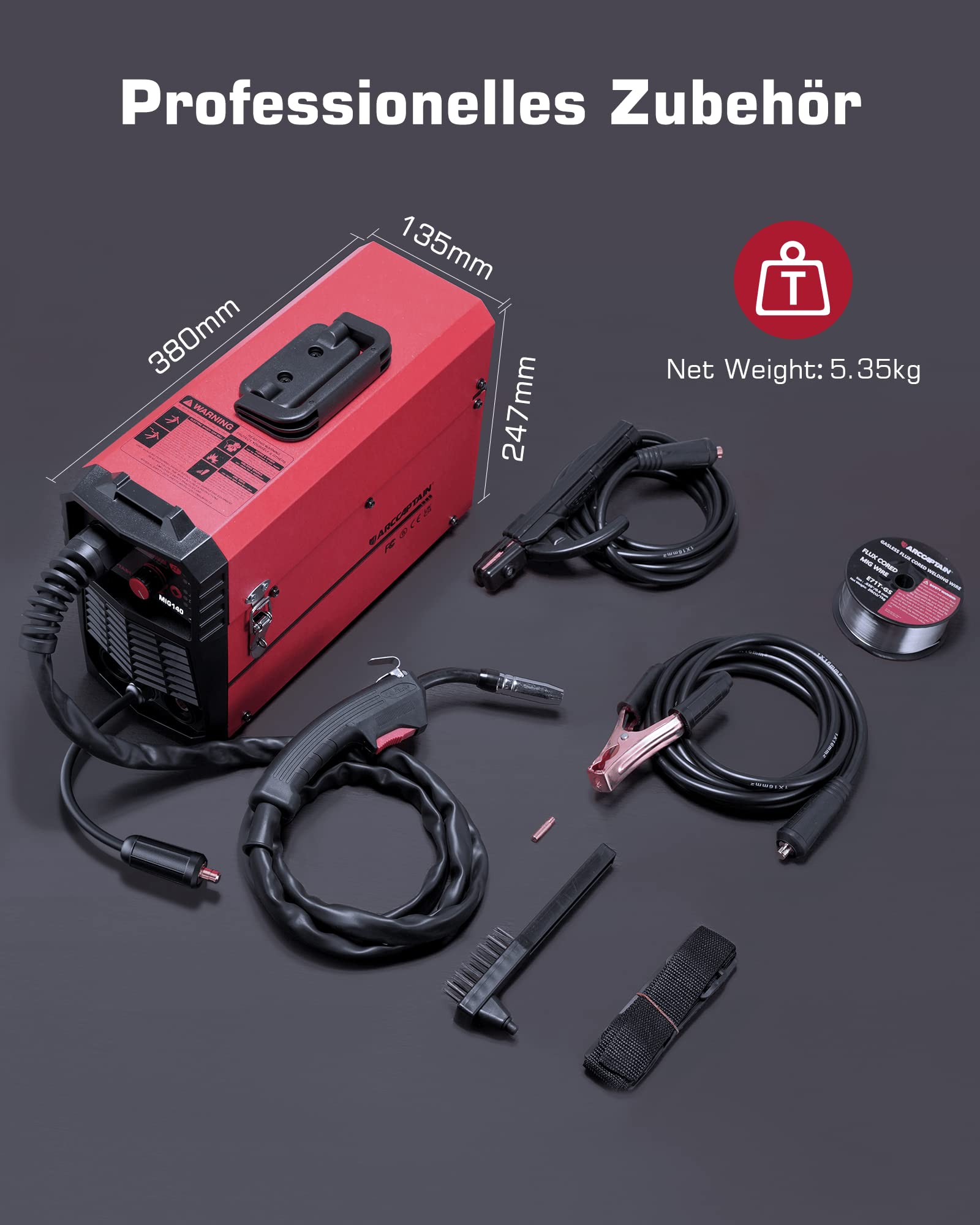 ["5-in-1 Welding Machine: Provides 5 welding modes – Flux-cored/MIG/MAG Gas Shielded Welding, Lift-TIG, and MMA Stick Welding – and meets various requirements (a separate Lift-TIG torch is required). Features adjustable current and a 10-level wire feeding control for precise welding of carbon steel, stainless steel, or even thicker steels.","Automatic Wire Feeding: Equipped with advanced IGBT technology and powerful 140A ignition current. The recommended current and wire feeding speed are automatically adjusted to the selected welding wire diameter (options: 0.8mm/0.9mm/1.0mm). The MIG welding machine is ideal for beginners or individuals learning welding and effortlessly completing small projects at home.","Safety Features: Includes powerful cooling and overheat protection, as well as functions like Hot Start and Anti-Stick. The welding machine comes with a pre-installed MIG torch and power cable, allowing you to start welding right out of the box. It includes overcurrent protection, overload protection, overheat protection, and overvoltage protection, extending the machine's lifespan.","Portable and Compact: Weighing only 5.35 kg, this device is easy to take anywhere thanks to the integrated handle or shoulder strap. The package includes: 1 MIG140 welding machine, 1 MIG torch, 1 ground clamp, 1 electrode holder, 1 roll of 0.030\" / 2 lb flux-cored wire, 1 contact tip 0.8mm/0.030\", 1 contact tip 0.9mm/0.035\", 1 conductive nozzle, 1 brush with hammer, and 1 user manual (Italian not included).","Excellent Service: ARCCAPTAIN welding machine has undergone a variety of professional tests and certifications, including TÜV and ANSI standards, before leaving our factory. And the welding machine comes with 2 years of quality support."]