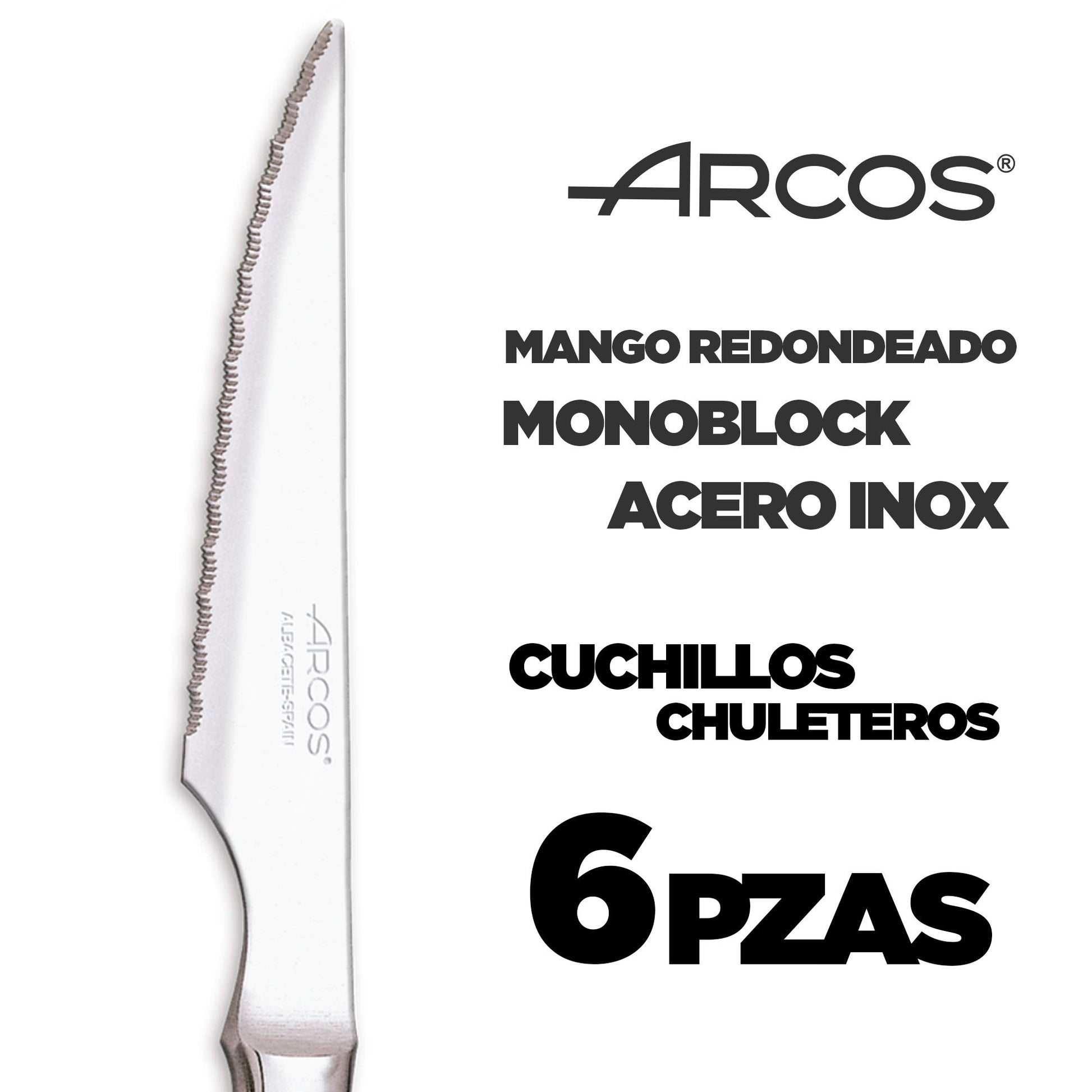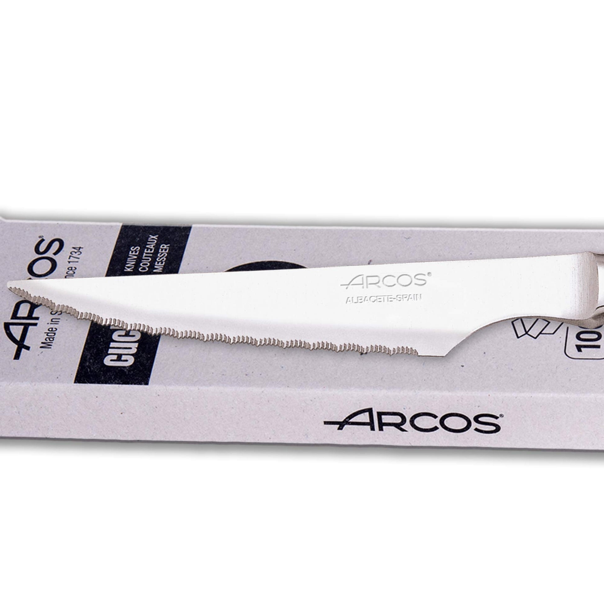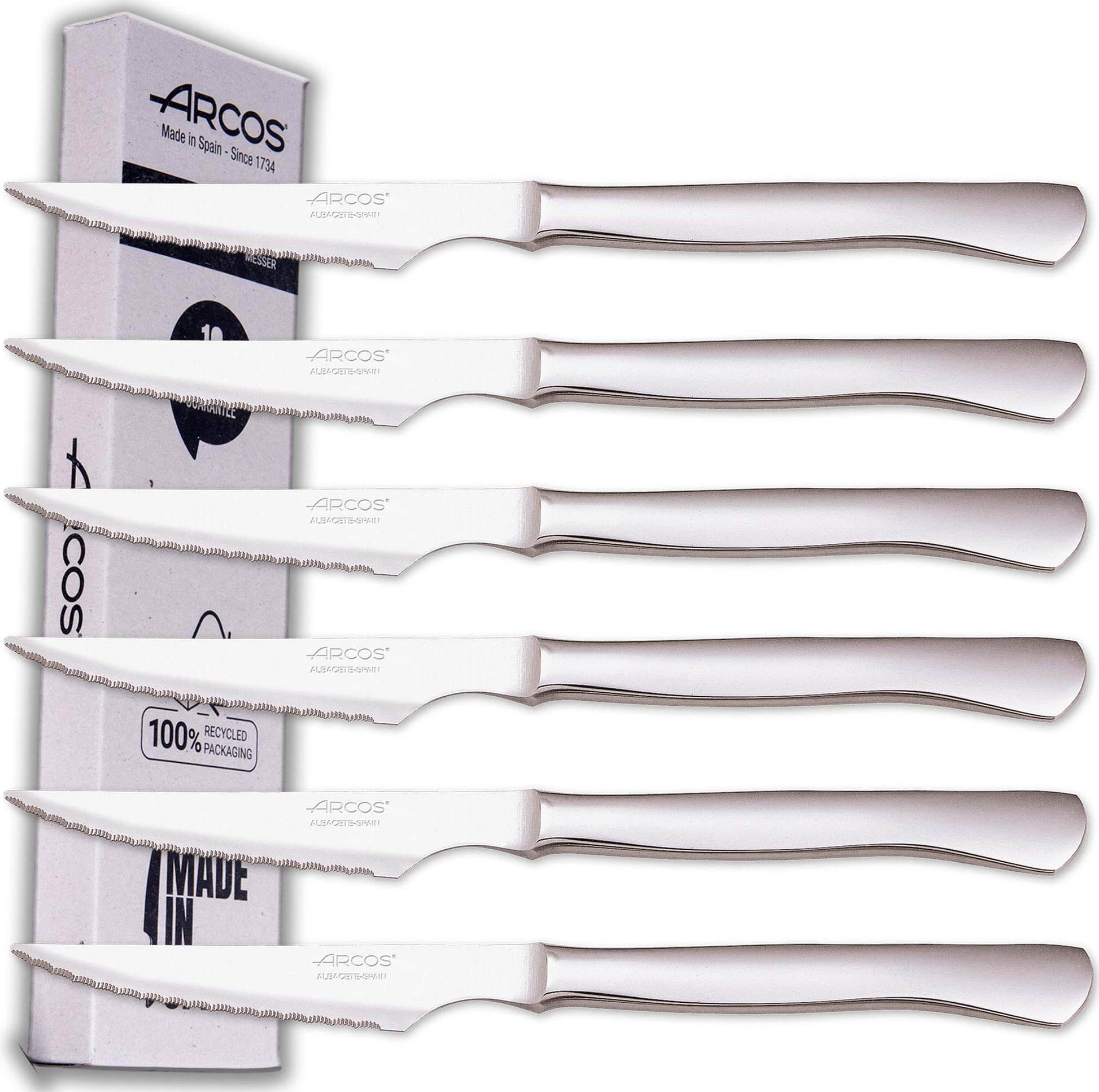 ["Meat knife | Set of 6 stainless steel knives, brand Arcos, table knife with saw.","Arcos steak knife | Blade 4.33 inches | Meat knife | Stainless steel cutlery.","One piece: Monoblock knife with handle, made of one piece of stainless steel.","Cutlery: Waterproof and resistant cutlery, not affected by dishwasher use.","Sustainable package: Environmentally friendly cardboard packaging avoids the use of plastic and reduces environmental pollution."]