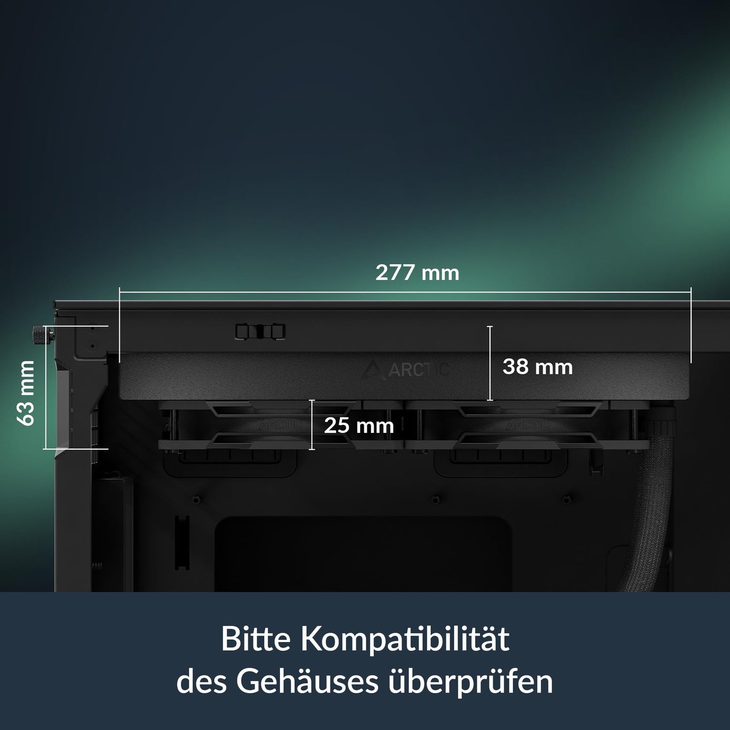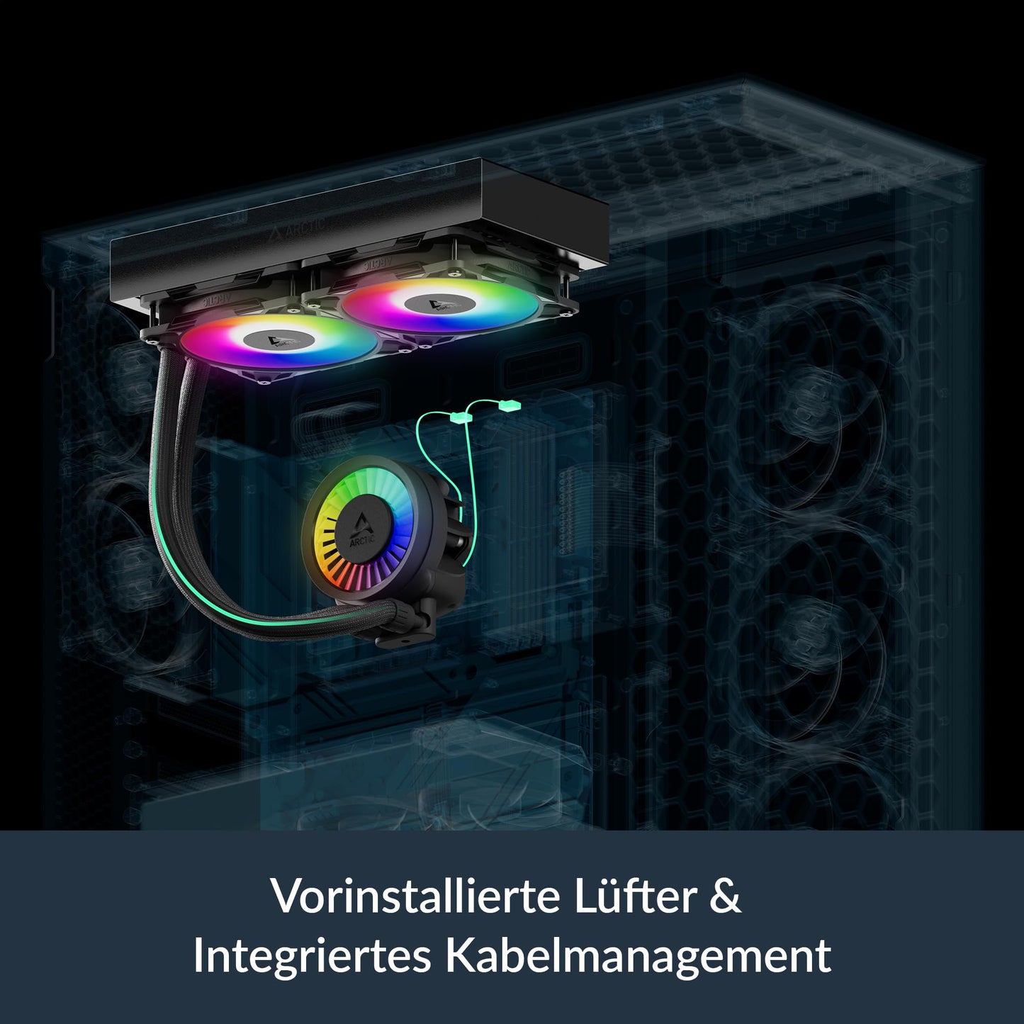 ["CONTACT FRAME FOR INTEL LGA1851 | LGA1700: Optimized pressure distribution for longer CPU lifespan and improved heat dissipation","ARCTIC'S P12 PRO FANS: Increased performance at every speed – more powerful and quieter than the P12, especially at low RPM. Higher maximum speed for optimal cooling performance under heavy load","NATIVE OFFSET MOUNTING FOR INTEL AND AMD: Shifting the Cold-Plate center towards the CPU hotspots ensures more efficient heat transfer","INTEGRATED VRM FAN: PWM-controlled fan lowers temperature of voltage regulators for reliable performance","INTEGRATED CABLE MANAGEMENT: PWM cables of radiator fans are integrated into tube sleeves for a clean single cable connection to motherboard"]
