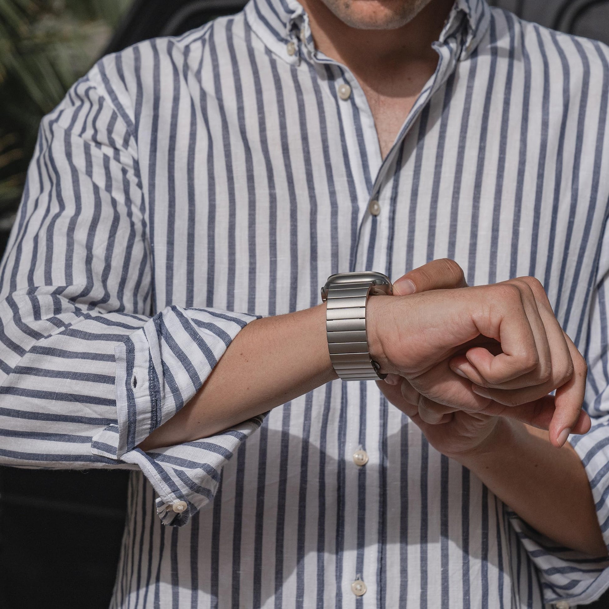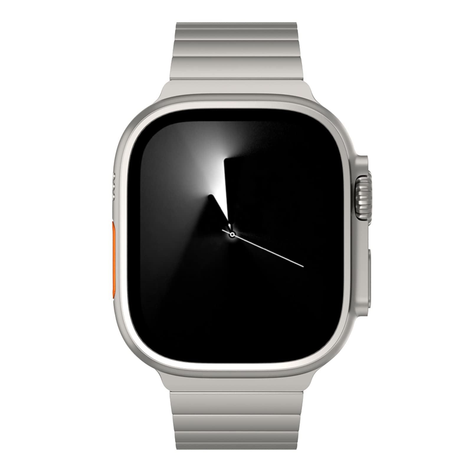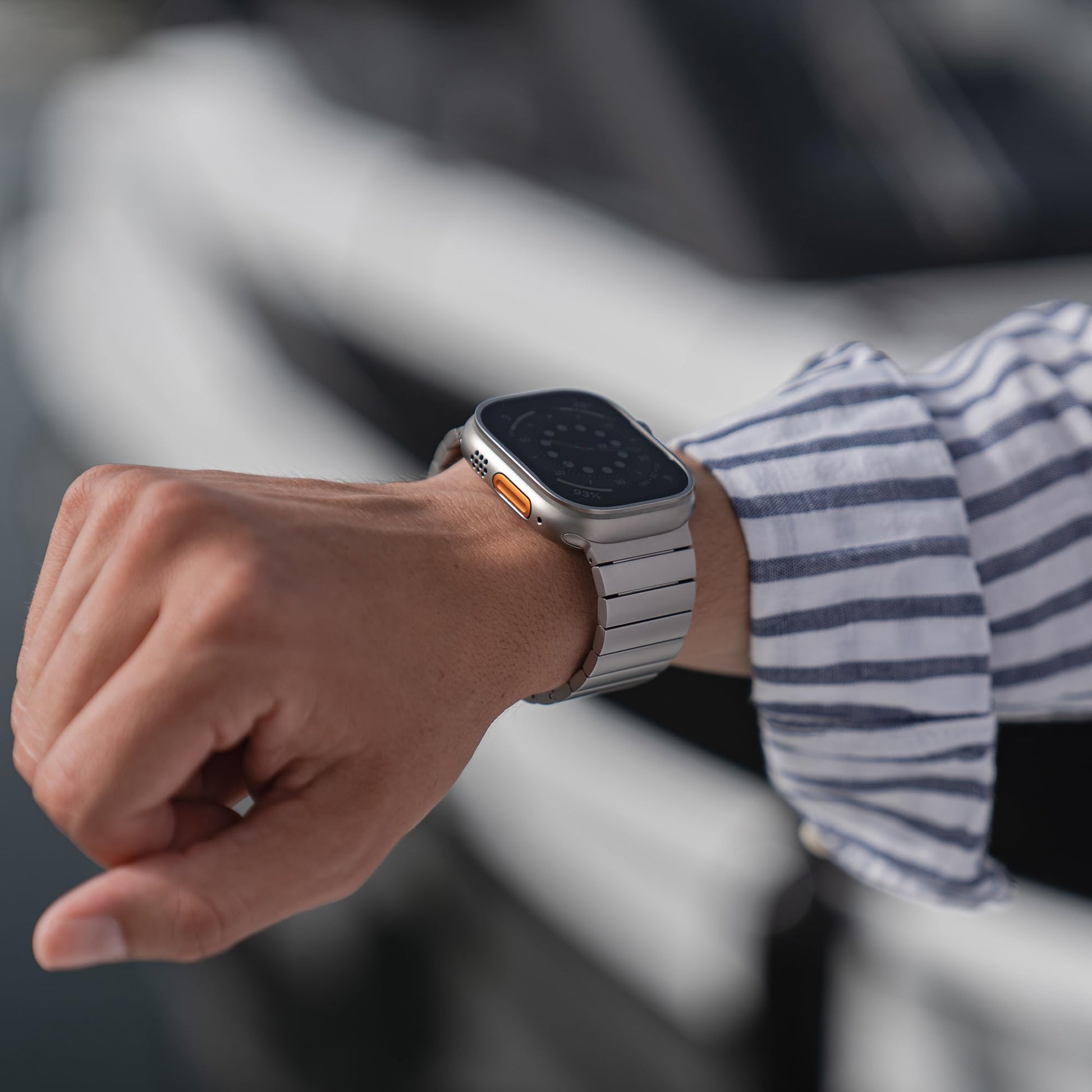 ["Titan Grade 2: This high-quality bracelet is made of genuine Titanium Grade 2. The surface is optimally cleaned through an elaborate sandblasting process, maintaining its elegant matte texture. It perfectly fits the Apple Watch Ultra 49 mm with 3.5 mm thick links and a band width of 24 mm, a pure expression on your wrist.",