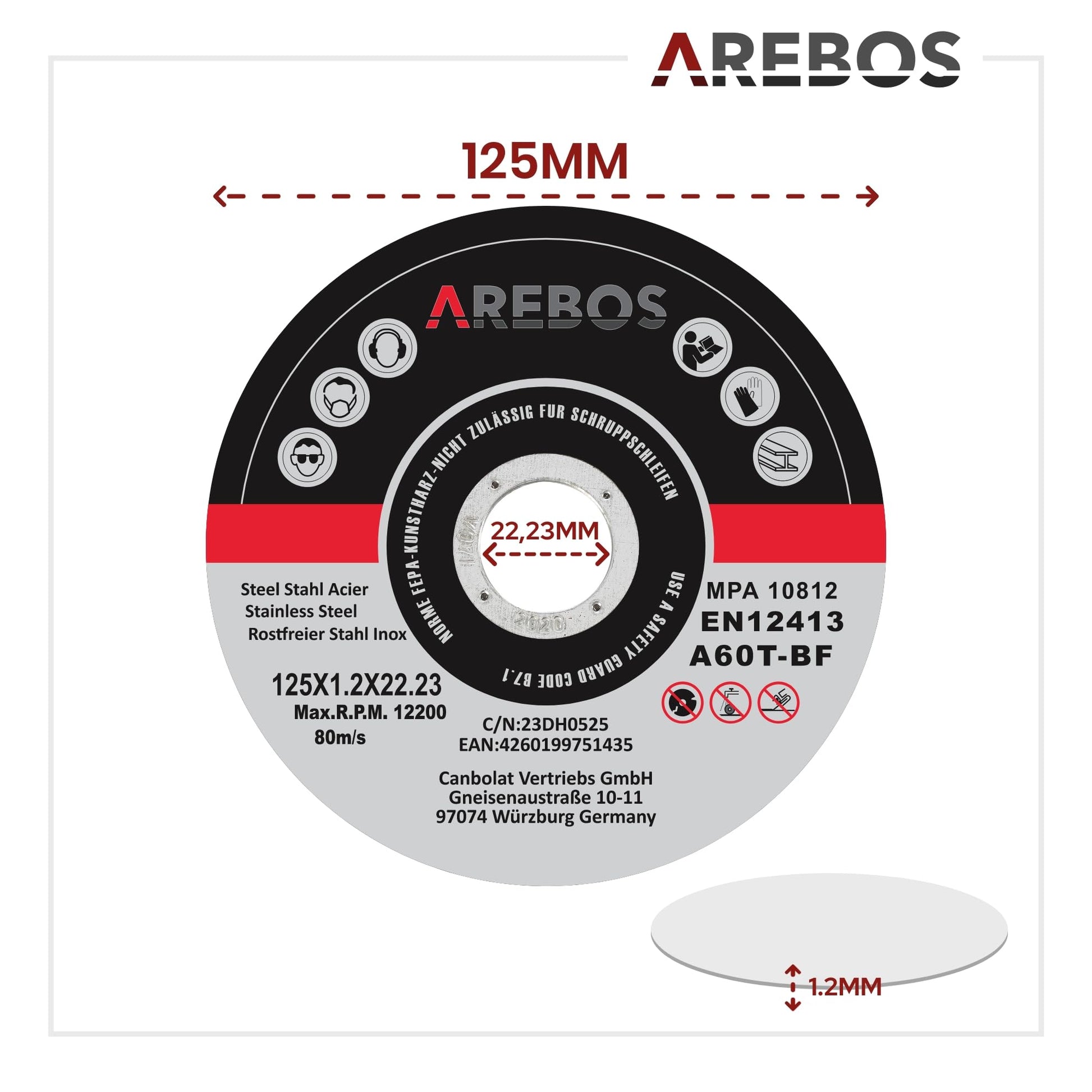 [Compatibility] The AREBOS cutting discs are compatible with all common angle grinder models. With a sliding diameter of 125 mm, a hole diameter of 22.23 mm, and a disc thickness of 1.2 mm, the cutting discs are suitable for a variety of tasks.