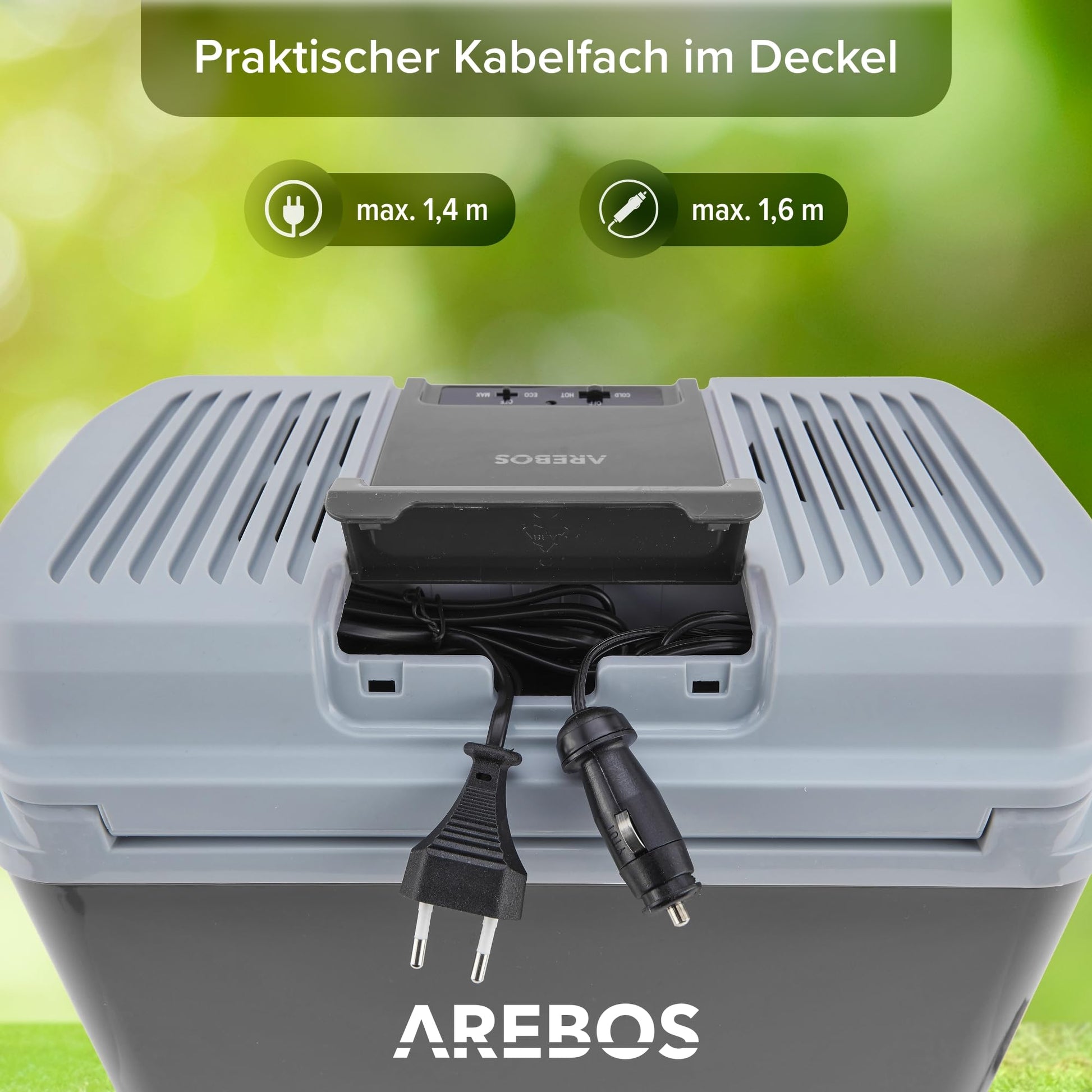 "For on the go: The coolbox comes with a 230V cable for traditional European sockets and a 12V cable for the cigarette lighter, enabling the box to function in your vehicle."