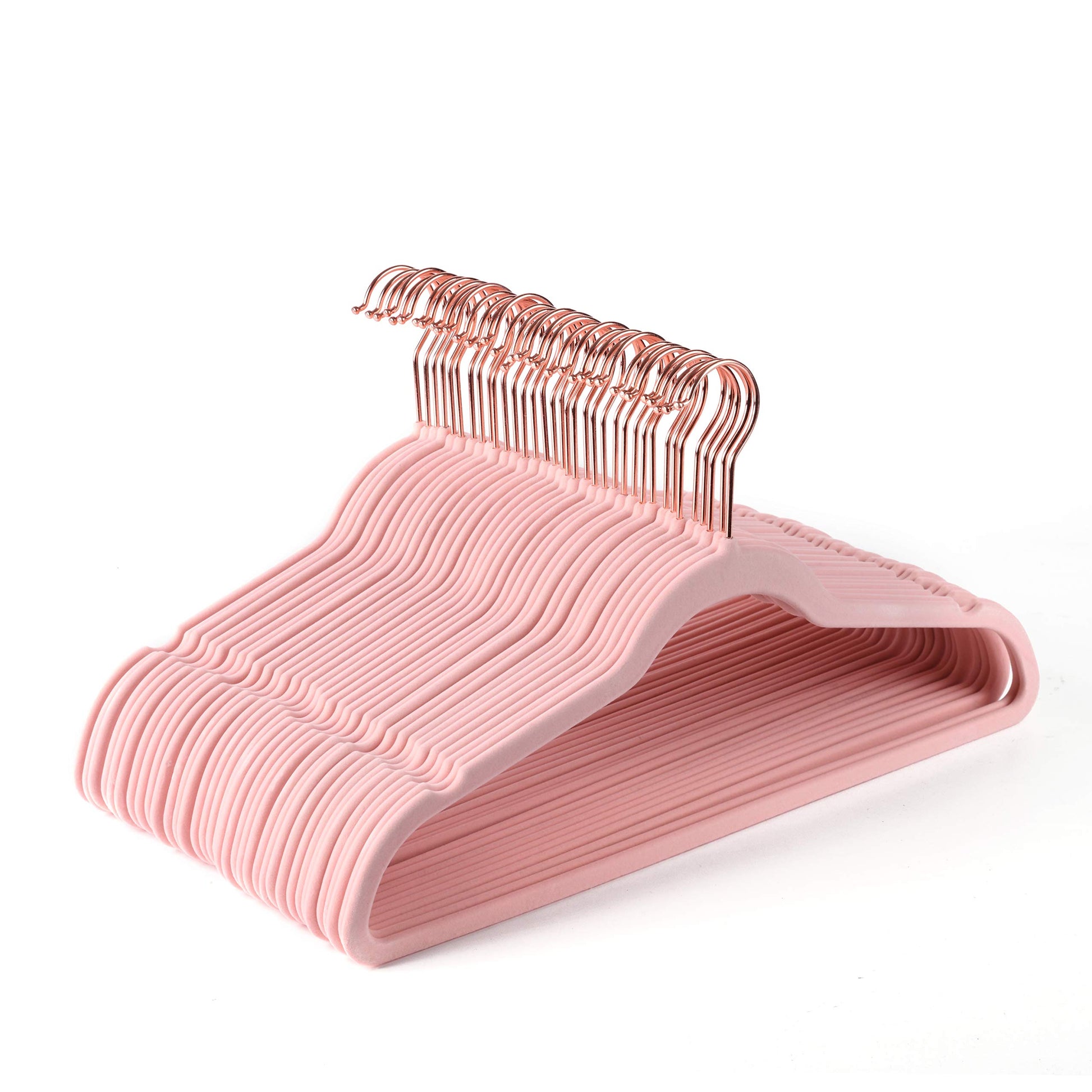 "Beautiful Rose Gold Hangers: 50 pink velvet hangers with 360° swivel beautiful rose gold/copper hooks. Just a simple twist to hang without falling out. Turn them in the desired direction.