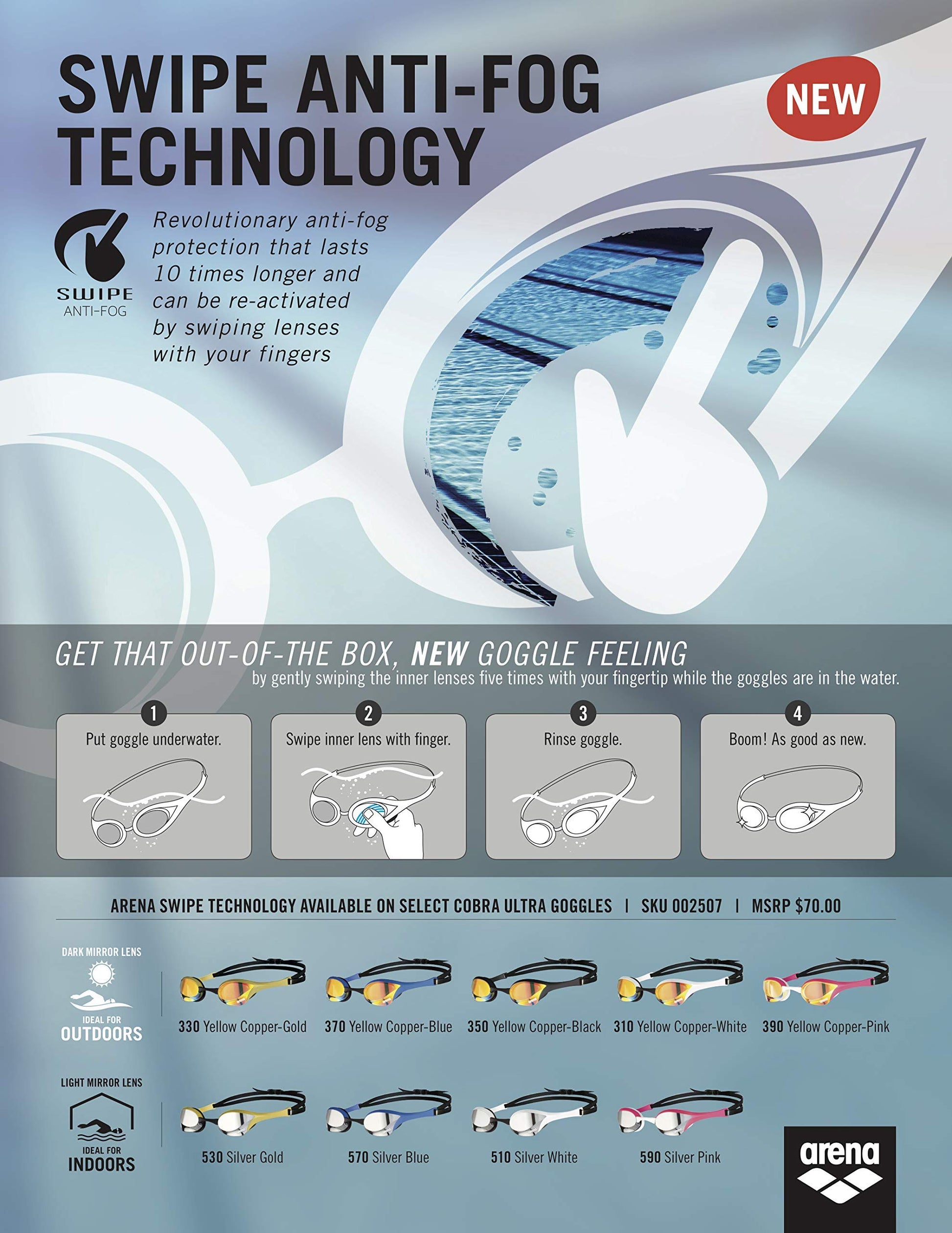 ["COMPETITION GOGGLES: The arena Cobra Ultra Swipe Mirror is a state-of-the-art competition goggle with mirrored lenses and our innovative Swipe Anti-Fog Technology","SWIPE ANTI-FOG: When the lenses fog up, swipe 5 times with your fingertips on the inside of the lenses while holding the goggles underwater. This activates the anti-fog protection, which lasts 10 times longer thanks to this technology","COMFORTABLE AND SECURE: Swim goggles that can be adjusted to the face and nose shape thanks to the 5 interchangeable nose bridges. The adjustable strap and innovative temple design ensure a secure fit","FOR COMPETITIVE SWIMMERS: The arena competition goggles approved by the World Aquatics (FINA) are designed for competitive swimmers and triathletes. The lenses have a low profile, are also mirrored, and provide UV protection","COMPOSITION: These unisex swim goggles are made of 70% polycarbonate, 20% silicone, 10% thermoplastic elastomer, and are PVC free","CLEAR LENSES: Swim goggles for adults with clear lenses - ideal for poorly lit environments and for those who enjoy swimming in bright light"]